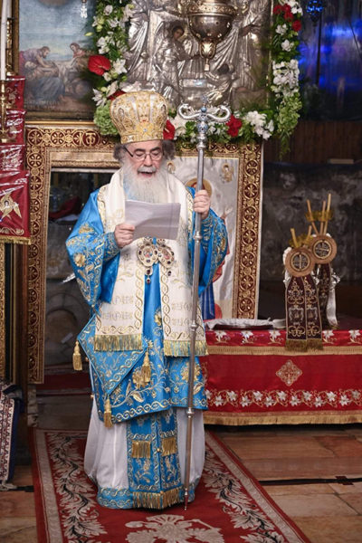 We, my beloved brothers, who are blessing the sacred Dormition of the Virgin Mary, the Mother of God and our Saviour Christ, entreat her not to stop beseeching her Son and God for our souls and for the peace of the tested earth, which hosts her empty Tomb. Amen. Have many blessed and peaceful returns”.
