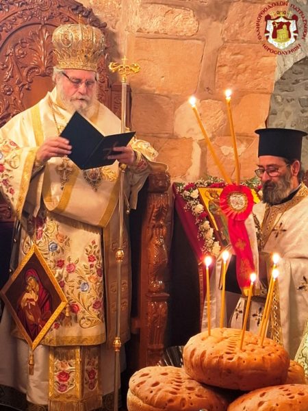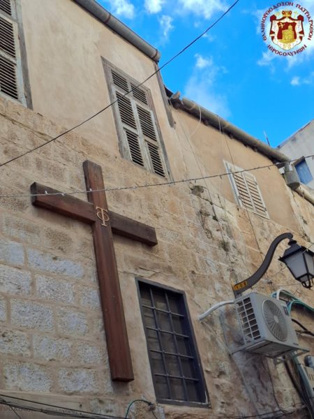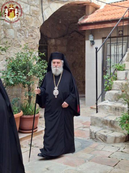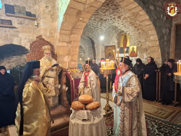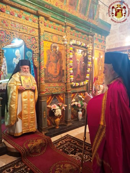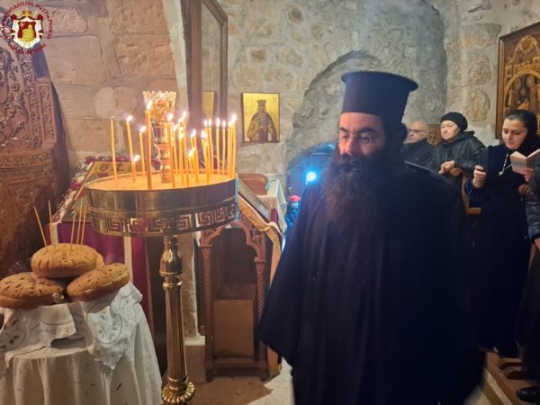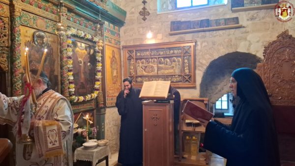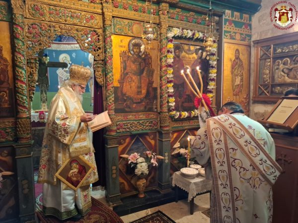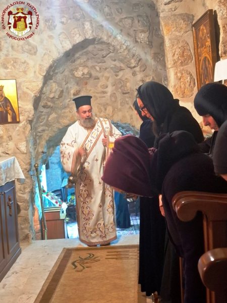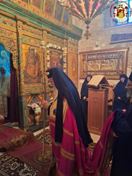 In remembrance of this miracle, Vespers was celebrated on the eve, together with the First Stasis of the Salutations, and the Divine Liturgy on the following morning at the Holy Monastery of the Saints Theodore in the Old City of Jerusalem. The services were presided over by His Eminence Metropolitan Hesychios of Capitolias, with the Holy Sepulchre Archimandrites Philoumenos, Stephanos, and Amphilochios, Priest Nektarios, and Archdeacon Mark. The chanting was delivered by Hierodeacon Prodromos and the nuns Maria and Sebastiani. Also participating were members of the sisterhood, Jerusalemite faithful, with the honourable presence of members of the Greek Consulate General, and a few pilgrims, owing to the adverse circumstances of the war which has just begun.