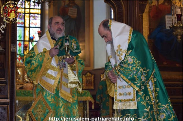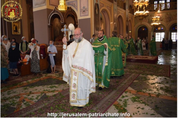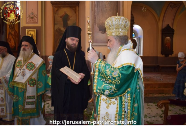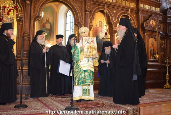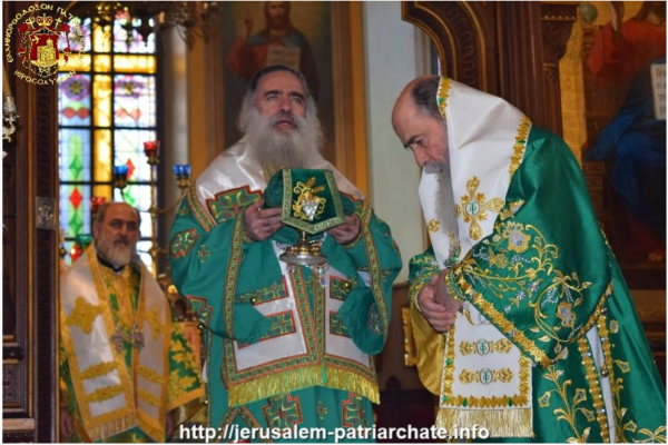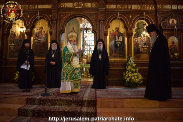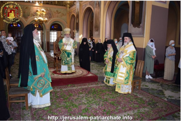 The Festal Divine Liturgy was officiated by H.H.B. our Father and Patriarch of Jerusalem Theophilos, with co-celebrants their Eminences; Metropolitan Isychios of Kapitolias, the Arhcbishops; Aristarchos of Constantina and Theodosios of Sebastia, His Eminence Metropolitan Joachim of Helenoupolis, Hagiotaphite Hieromonks among whom the Elder Kamarasis Archimandrite Nectarios, the Head of the Russian MISSIA Archimandrite Alexander and other Priests of the Russian Church, Archdeacon Mark and Hierodeacons of the Russian MISSIA, as the chanting was delivered by the Nuns of the MISSIA and the service was attended by Russian faithful Christians.