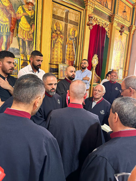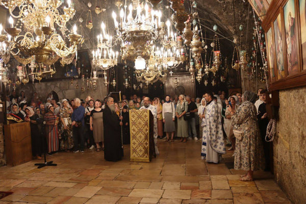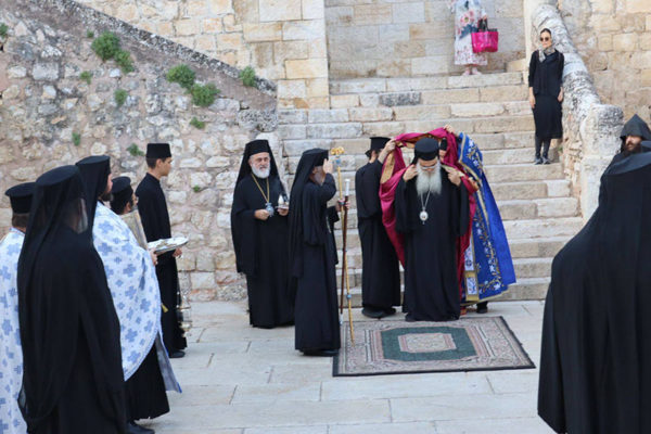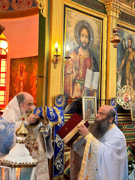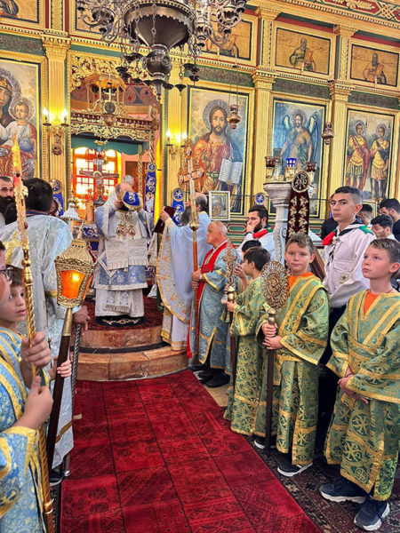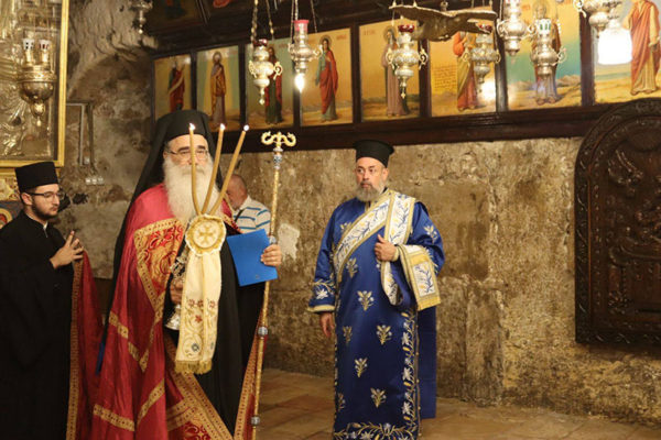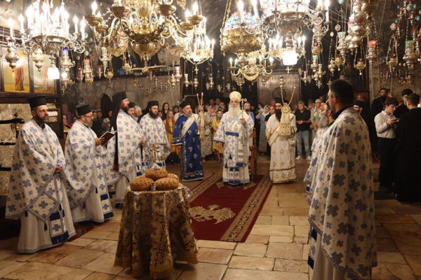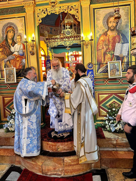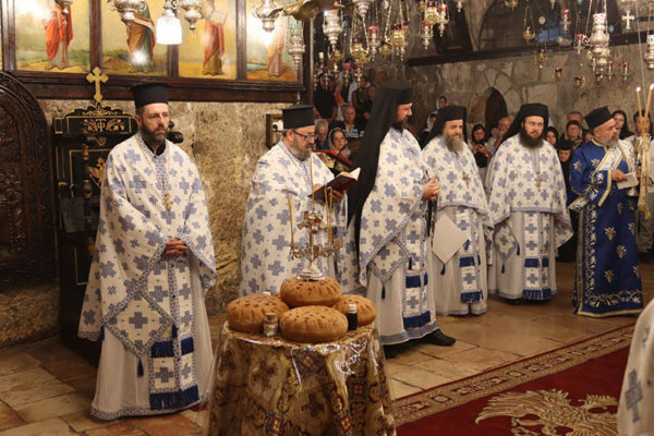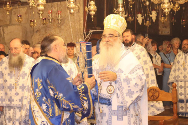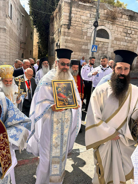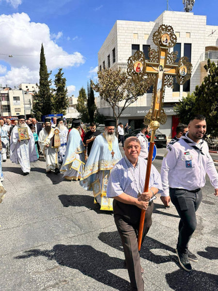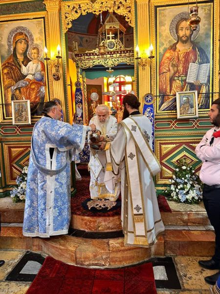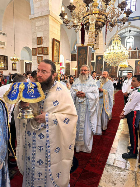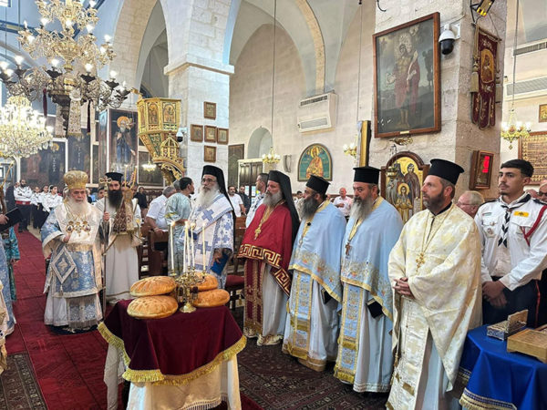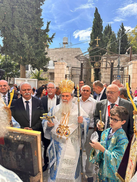On Sunday, September 9/22, 2024, by transference at the magnificent Church dedicated to the Nativity of the Theotokos in Beit Jala. The Liturgy was officiated by H.H.B. our Father and Patriarch of Jerusalem Theophilos with con-celebrants their Eminences the Archbishops, Aristarchos of Constantina and Aristovoulos of Madaba, the Holy Sepulchre Hieromonks, Raphael, Ieronymos and Porphyrios, the ministering Priests of the Church Boulos, Yusef and Elias, Priest Ioannis, Archdeacon Mark and Hierodeacon Dositheos. The Hegoumen of Beit Jala Archimandrite Ignatios was absent due to a temporary illness. The chanting was delivered by the Byzantine choir of Beit Jala, as the service was attended by the full congregation of the town.