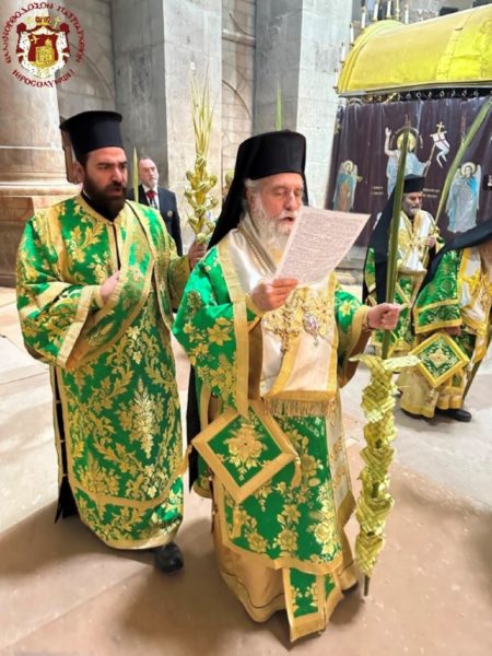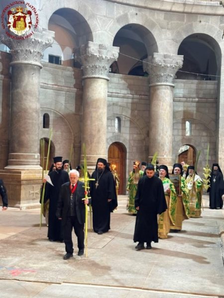 After the Divine Liturgy, a procession followed three times around the Holy Sepulchre and through the shrines, during which His Beatitude, the Hierarchs, the Priests, and the others held palm branches as a declaration of their faith and of their worship toward our Lord, Who entered triumphantly into Jerusalem when the children of the Hebrews received Him. The procession concluded with the reading of the Resurrection Gospel before the Holy Tomb.