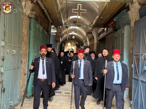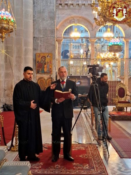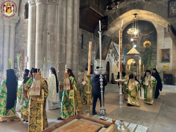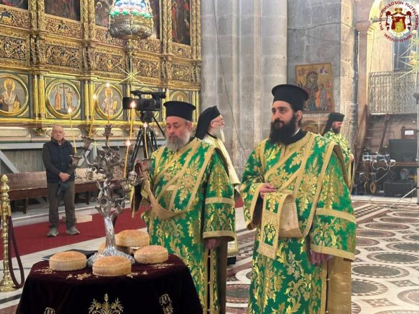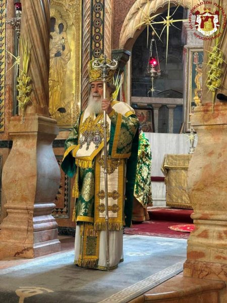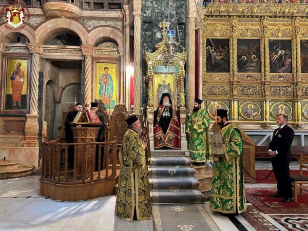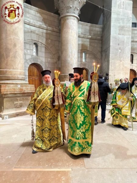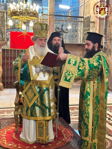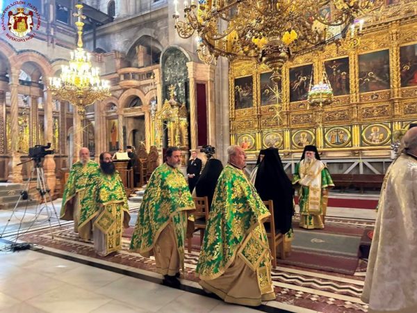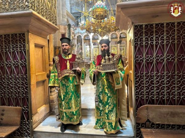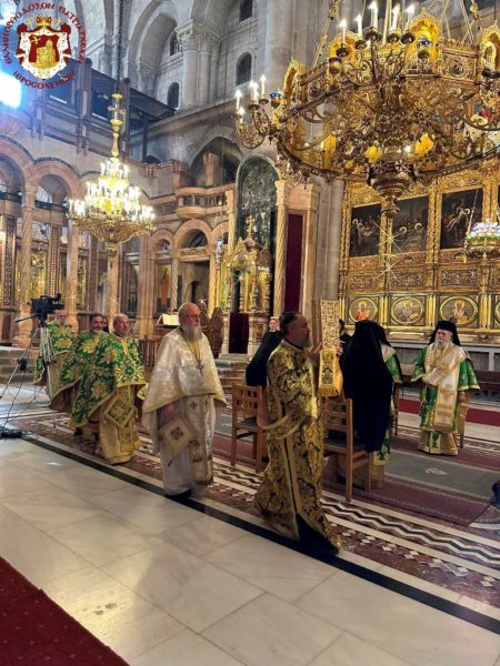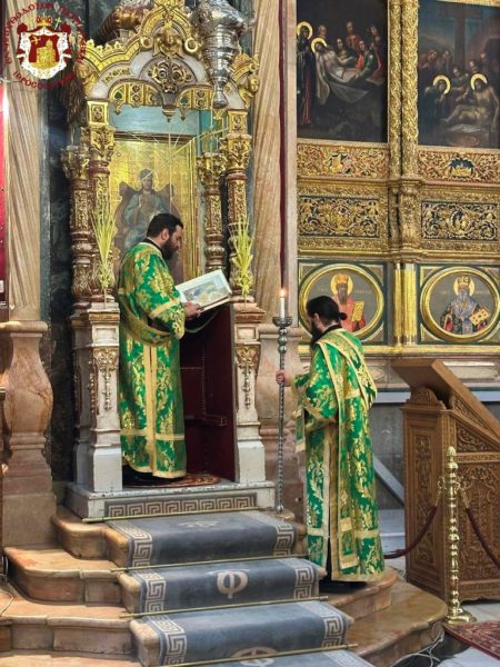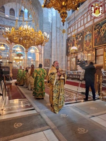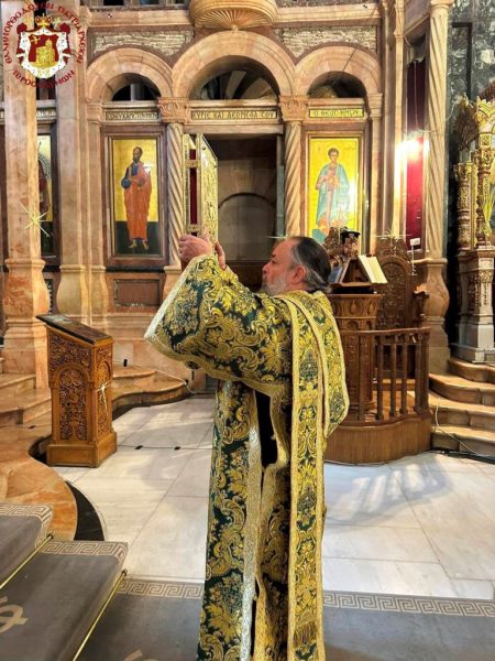 Vespers and the Divine Liturgy were presided over by His Beatitude, Our Father and Patriarch of Jerusalem, Theophilos III, concelebrating with His Eminence Metropolitan Hesychios of Capitolias, and Their Eminences the Archbishops Theophanes of Gerrash, Dorotheos of Abila, and Aristarchos of Constantina, together with Holy Sepulchre Hieromonks, in the honourable presence of the Consul General of Greece in Jerusalem, Mr Dimitrios Angelosopoulos. Only a limited number of monks residing within the Church, namely the guardians of the Shrine, attended, in accordance with police measures, due to the ongoing destructive war.