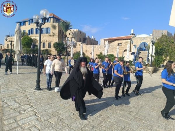 Following the warm welcoming reception by the body of Scouts and the students of the Yaffo School, the Divine Liturgy was presided over by H.H.B. our Father and Patriarch of Jerusalem Theophilos, with the co-celebration of their Eminences, Metropolitan Kyriakos of Nazareth, the Archbishops, Damascene of Yaffo and Aristarchos of Constantina, Holy Sepulchre Hieromonks with first in rank the Archimandrite Alexios, other local and visiting Priests, Archdeacon Mark and Hierodeacons Eulogios and Patrikios. The chanting was delivered by Hierodeacon Simeon and the Yaffo Byzantine choir, as the Liturgy was attended by a large congregation from various countries, the Ambassador of Greece to Tel Aviv Mr Kyriakos Loukakis and members of the Greek Embassy and the Ambassador of the Republic of Cyprus to Yaffo Mr Kornelios.