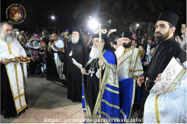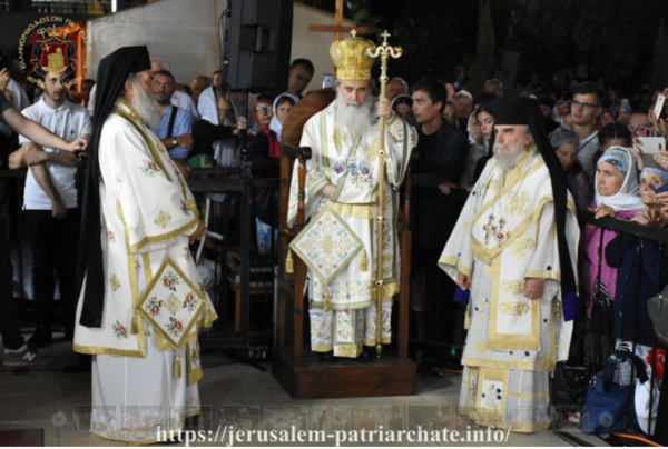 This event was primarily celebrated at the place where it happened, on Mount Tabor, with an all-night Vigil which was officiated by H.H.B. our Father and Patriarch of Jerusalem Theophilos, with co-celebrants the Most Reverend Metropolitan Isychios of Kapitolias, the Most Reverend Archbishop Aristarchos of Constantina, Hagiotaphite Hieromonks and visiting clergy from various Orthodox countries. The chanting was delivered by Priest George on the right and by the choir of the Patriarchal representative in Acre Archimandrite Philotheos on the left in Arabic, at the presence of a large crowd of faithful who prayed in contrition at the outdoor night atmosphere.