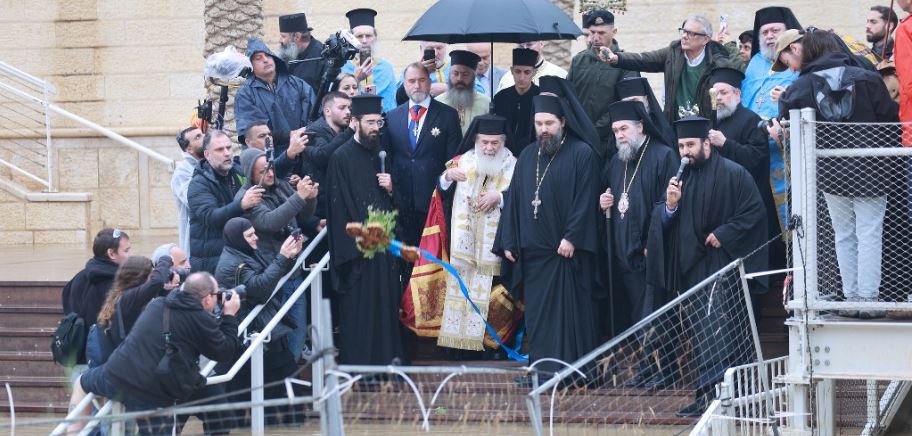After a short rest, His Beatitude departed, according to custom, for the River Jordan, travelling with His entourage by road via Jericho, the Monastery of Saint Elisha, the Governor/Administrator of the Palestinian Authority, and the Monastery of Saint John the Forerunner. There, in the morning, the Divine Liturgy and the Service of the Small Blessing of the Waters were celebrated by Archimandrite Klaudios and Priest Nectarios. Upon the arrival of His Beatitude, a supplication was offered, and the procession then set out on foot towards the River Jordan amid heavy rain, a sign of God’s blessing.