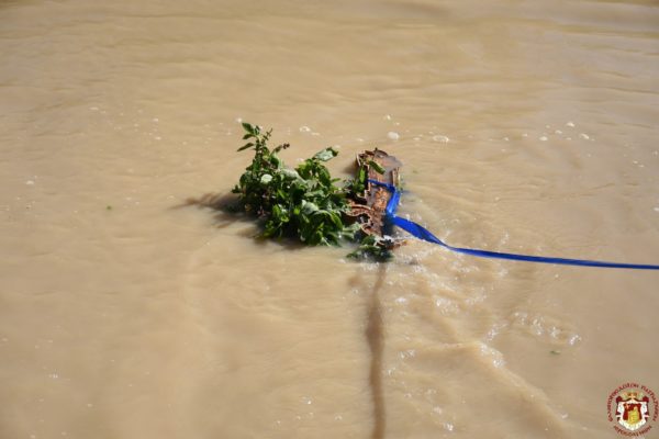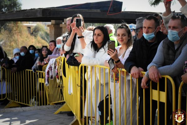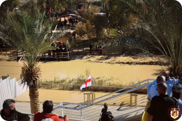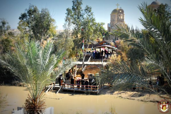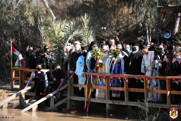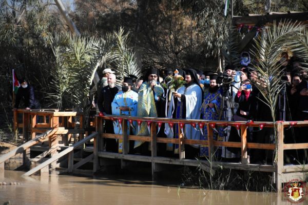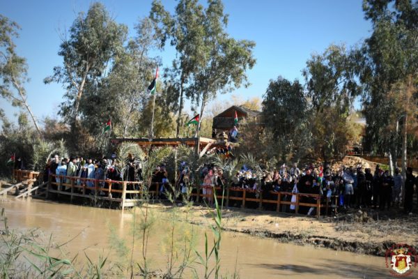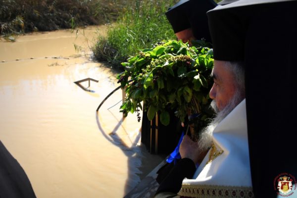 At the Monastery of Saint John the Baptist the 9th Hour of Theophany was read, to be followed by the procession down to the river Jordan. Vespers and the Service of the Sanctification of the waters were observed on the platform by the river and the service concluded with the diving of the Cross in the river under the chanting of the “When Thou wast baptised in the Jordan”. The same service was simultaneously held at the East Bank on the opposite side of the river.