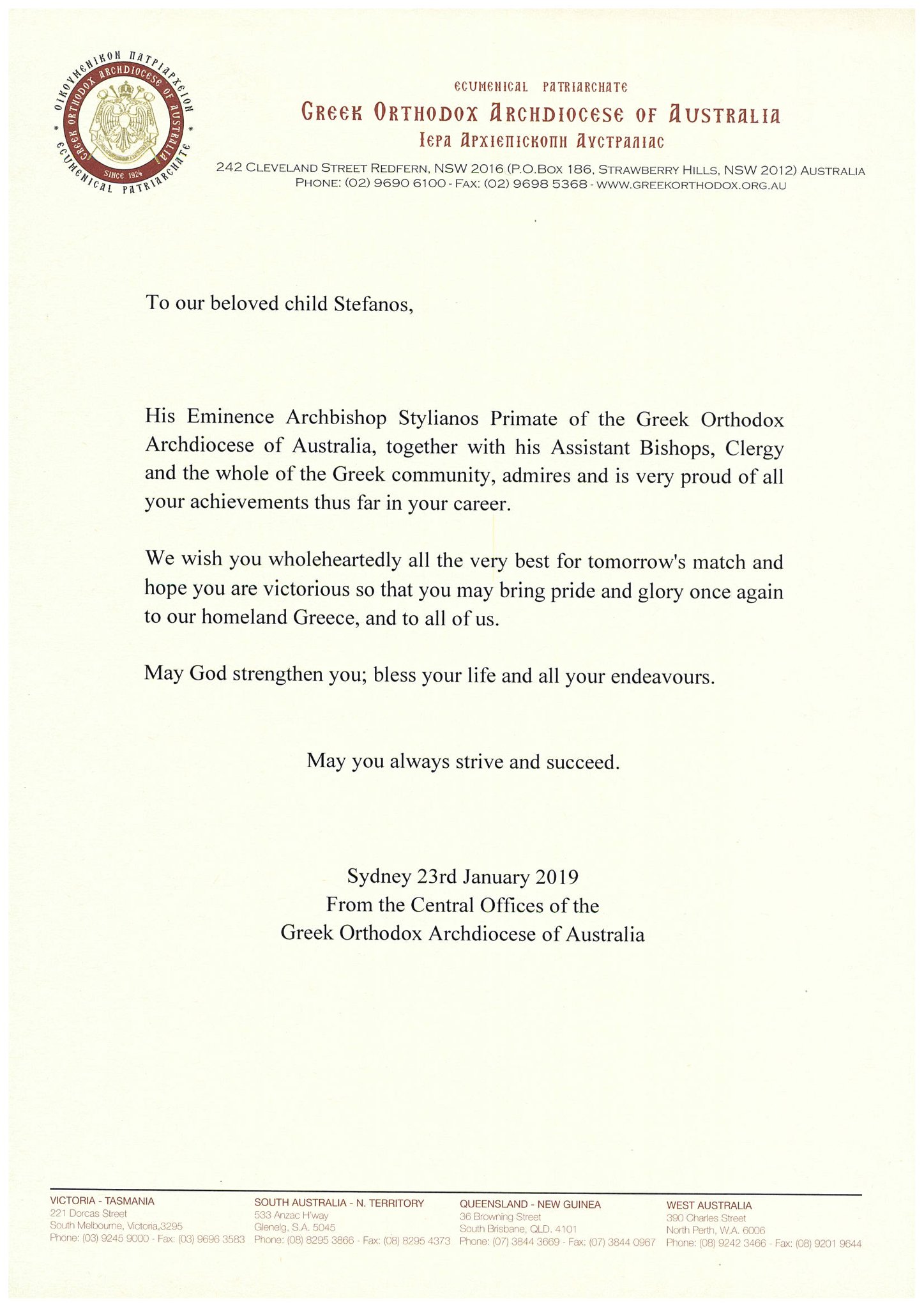 The Greek Orthodox Archdiocese of Australia congratulating Mr Stefanos Tsitsipas for his success thus far in the 2019 Australian Open Tournament.