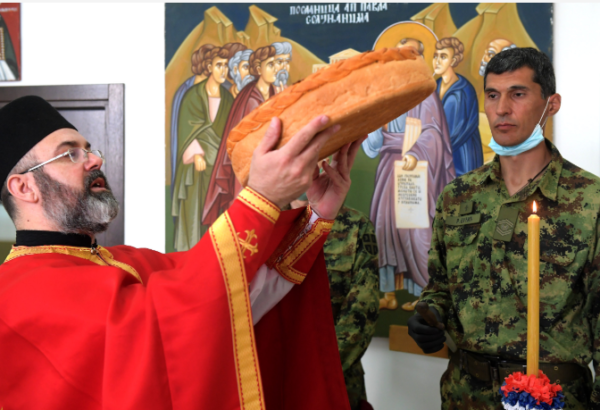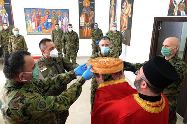 The celebration of St George’s Day began with the Holy Liturgy, officiated by the chief military priest, lieutenant colonel Sladjan Vlajic, followed by a traditional consecration of the slava offers and breaking of the slava loaf.