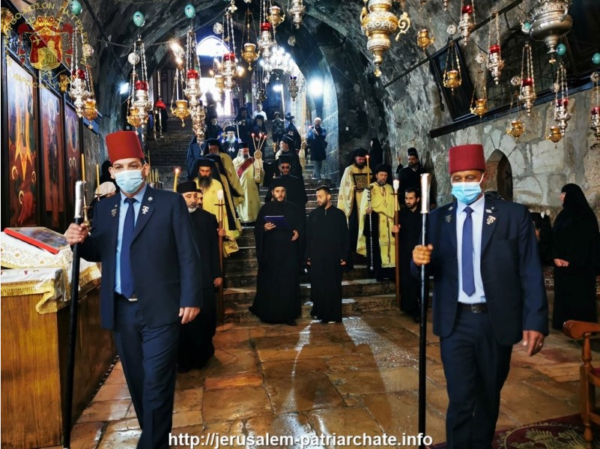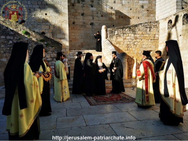 For this ceremony, the Hagiotaphite entourage, led by its Hegoumen His Beatitude the Patriarch of Jerusalem Theophilos, marched from the Patriarchate Headquarters down Via Dolorosa with short stops at the Holy Monasteries of St. Charalambos, Panagia Sayda Naya, Praetorion, The Ancestors of God Joachim and Anna and St. Stephen and arrived at the Hegoumeneion of Gethsemane.