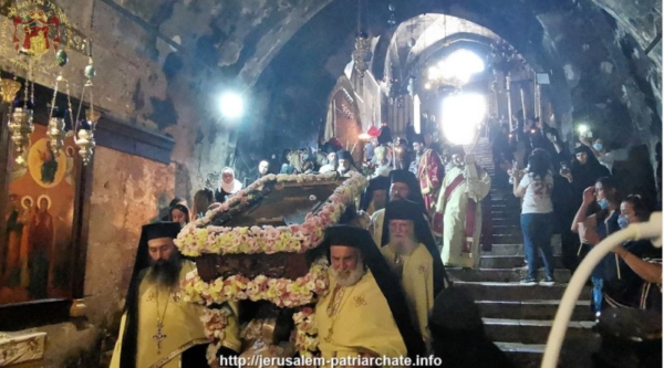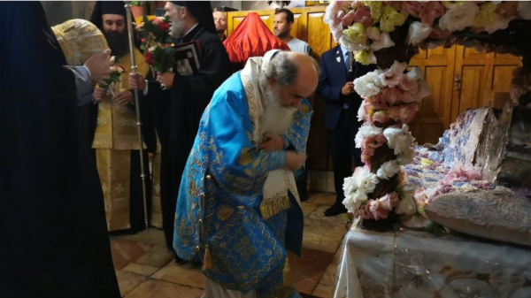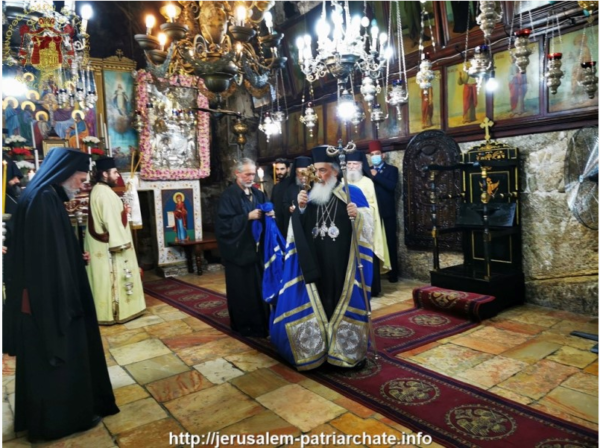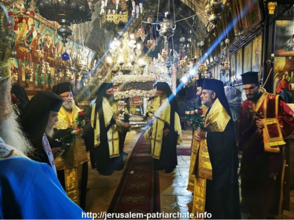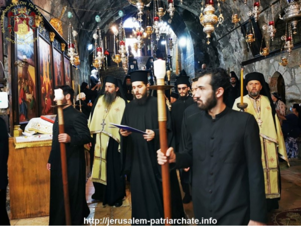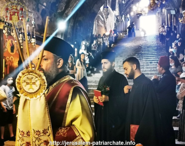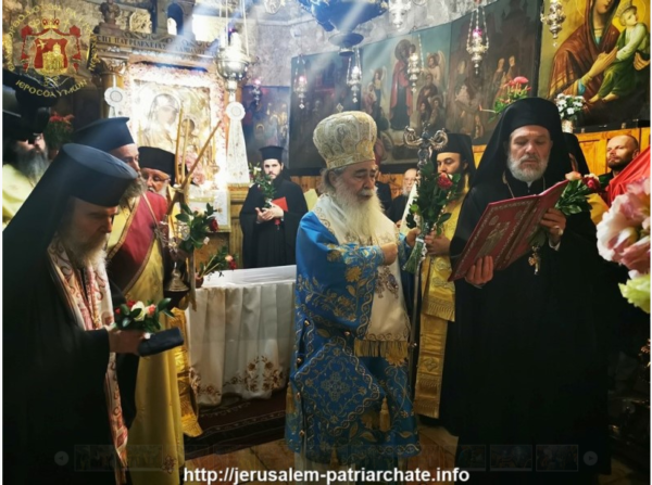 For Her excessive goodness and love, the Church of Jerusalem, the land where She lived and which She sanctified, honours Her, as it should today, with this Service of the Lamentations around Her Tomb, under the lead of His Beatitude our Father and Patriarch of Jerusalem Theophilos, and prays to Her to intercede for the unity in Christ of the Orthodox Churches, for the peace and good state of the whole world and of the Middle East, for the cessation of the brutal crimes of violence against innocent people and of the existing wars around the globe, for the rescue and treatment of shipwrecked refugees, for the help of the addicted to drugs youth, for the unity of the divided families and for the help of all of us who honour Her today at Her Most Sacred and Life-giving Tomb, so that by Her help we may continually convey a message of reconciliation and love to the world, and a witness of the Christian Orthodox life, to strengthen, comfort, sustain and guide to salvation the fulness of the Church and give Glory to our Trinitarian God. So be it.”