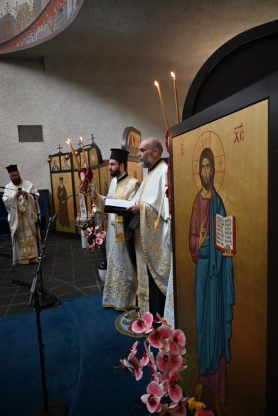 Concelebrating with the presiding Hierarch, His Eminence Metropolitan Maximos of Switzerland, were Their Eminences, Metropolitan Athenagoras of Belgium, Metropolitan Kyrillos of Rhodes, Metropolitan Polykarpos of Italy, Metropolitan Savvas of Nubia, Metropolitan Kallinikos of Arta, and His Grace Bishop Kyrillos of Olympus. The Divine Liturgy was attended by Priests and Deacons from the Holy Metropolises of Switzerland, Belgium and Rhodes, and the Holy Metropolises of the Church of Greece.