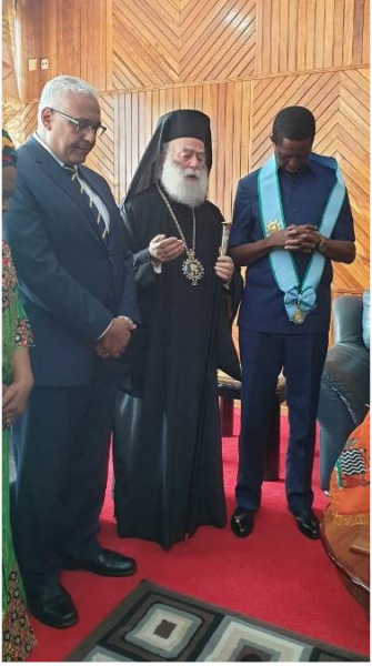 On the morning of Saturday, February 22, 2020, a formal meeting was held at the Presidential Palace of the Republic of Zambia between the Patriarch of Alexandria and All Africa Theodoros II and His Excellency the President of the Republic of Zambia Dr. Edgar Chagwa Lungu, who discussed, inter alia, issues of religious tolerance, the rights of vulnerable groups and persons, environmental protection, and gender equality. His Beatitude the Patriarch presented to the President the work of the Second Throned Patriarchate in Zambia and Africa in general, while His Excellency the President asked the Primate to pray for the peace, prosperity and stability of His country.