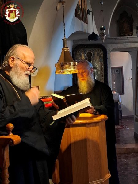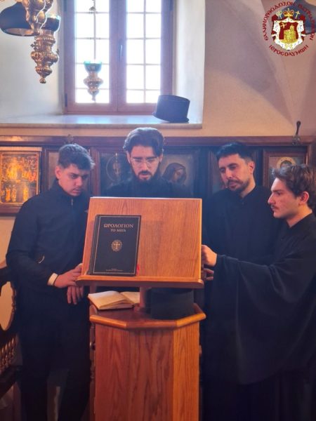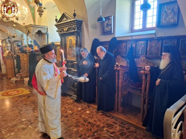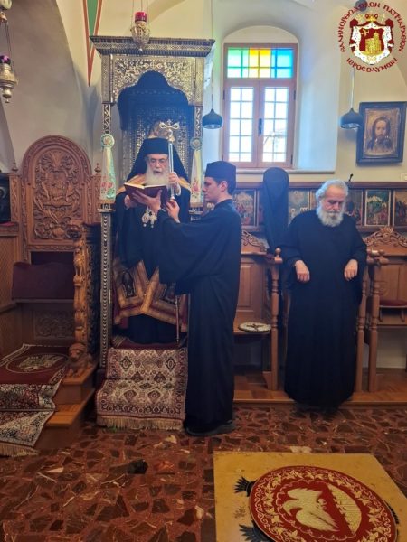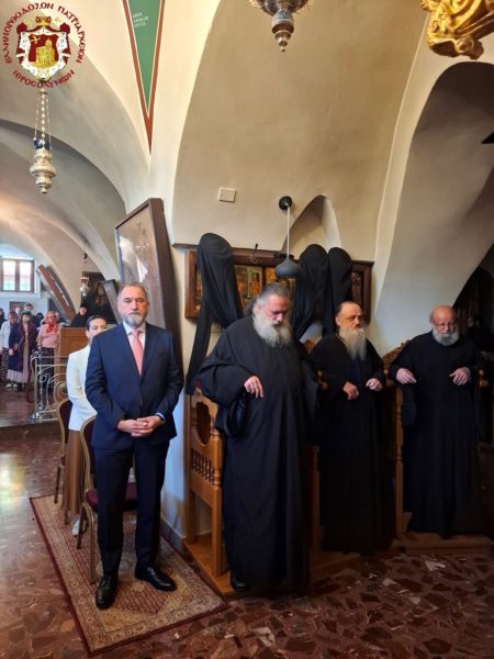 The Divine Liturgy was celebrated in the same manner as that of the night of the Resurrection at the All-Holy and Life-giving Tomb, by the ministering priest of the church, Archimandrite Kallistos, with His Beatitude our Father and Patriarch of Jerusalem, Theophilos III, presiding from the throne, with the hierarchs and the rest of the Fathers in prayerful participation; together with the Consul General of Greece in Jerusalem, Mr Dimitrios Angelosopoulos, the Consul Ms Anna Mantika, and representatives of the Orthodox Churches, namely of the Patriarchate of Moscow, Archimandrite Vassianos, and of the Patriarchate of Romania, Archimandrite Ioannis Megios.