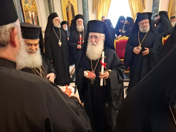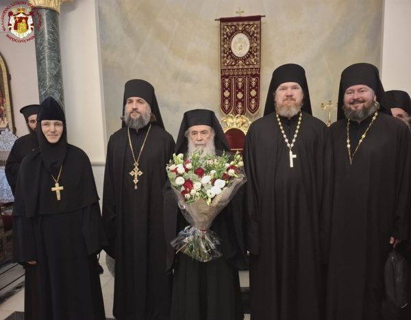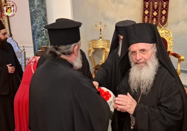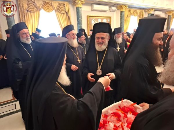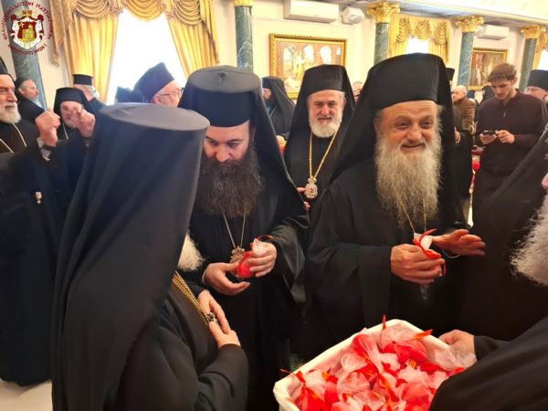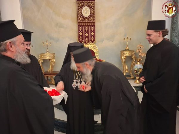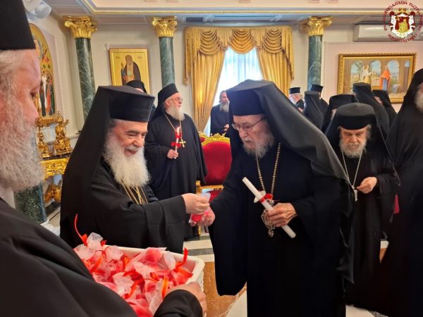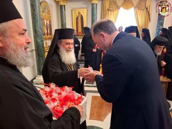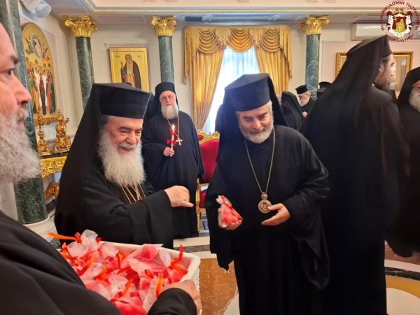 At the conclusion of the Divine Liturgy, the Patriarchal entourage went to the Patriarchate Hall with joyful psalmody led by the chanter Deacon Efstathios and his assistants, where the Patriarchal fraternal kiss of love took place, and His Beatitude distributed the Paschal eggs to the Brotherhood, the nuns, and all the pilgrims, whose number was increased on account of the ceasefire of the war.