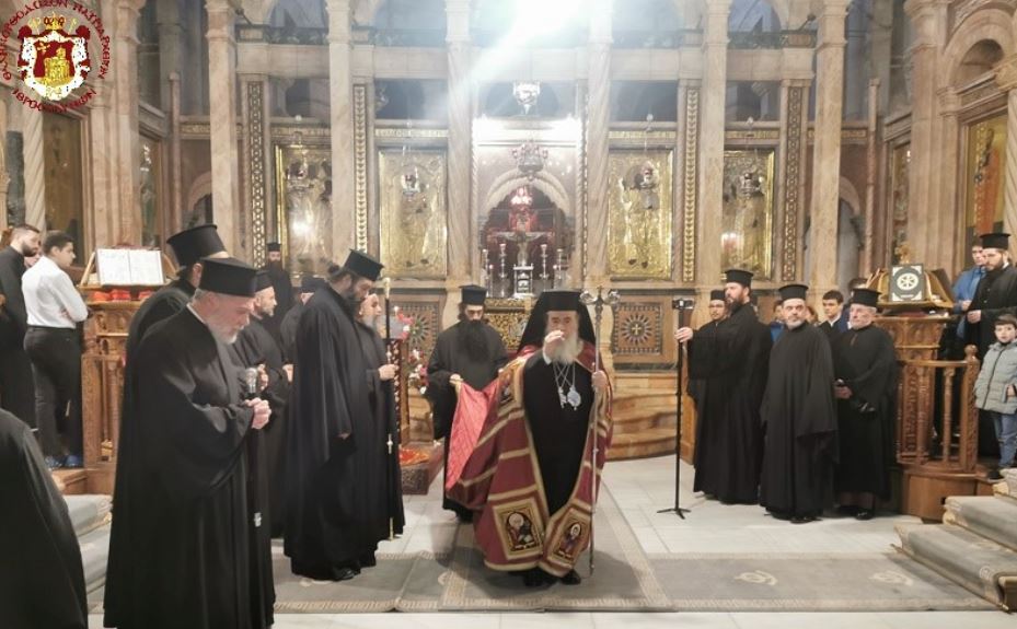 The First Stasis was read by the officiating the service, His Beatitude the Patriarch of Jerusalem Theophilos, the Second Stasis was read by the Geronda Secretary-General His Eminence Archbishop Aristarchos of Constantina, the Third Stasis was read by the Elder Sacristan His Eminence Archbishop Isidoros of Hierapolis, the Fourth and last was read by the Elder Dragoman Archimandrite Mattheos. The chanting was delivered by Hierodeacon Simeon and Mr Vassilios Gotsopoulos. The service was attended by the Consul General of Greece in Jerusalem Mr Evangelos Vlioras and members of the Church of Jerusalem and the Hagiotaphite Brotherhood.