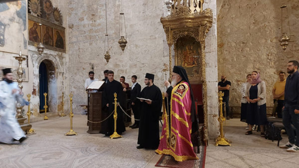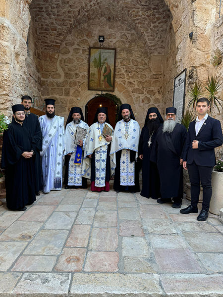 The Divine Liturgy was celebrated in the morning of the feast, presided over by His Eminence Metropolitan Kyriakos of Nazareth, with con-celebrants the Archimandrites Meletios, Stephanos, Klaudios, Seraphim, the visiting from Greece Archimandrite Stephanos and Hierodeacon Simeon. The chanting was delivered by the Byzantine choir leader of the Church of the Holy Sepulchre Mr Eustathios Tsoumanis with the Patriarchal School of Sion students. The Consul General of Greece attended the service in Jerusalem Mr Dimitrios Angelosopoulos, as well as local believers from Jerusalem and other cities.