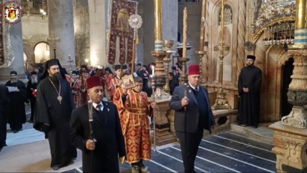 This true and redeeming event was celebrated in the Church of the Holy Sepulchre with Great Vespers on Saturday afternoon, which is called “parrhesia” and includes a reception and veneration at the Holy Deposition then at the Holy Sepulchre, and the Horrendous Golgotha, ringing of the church bells, incense offering around the shrines, Great Entry and blessing of bread. The service was presided over by H.H.B. our Father and Patriarch of Jerusalem Theophilos, with Hieromonks and deacons concelebrating, and faithful members of the Church of Jerusalem and a few pilgrims attending the prayer.
