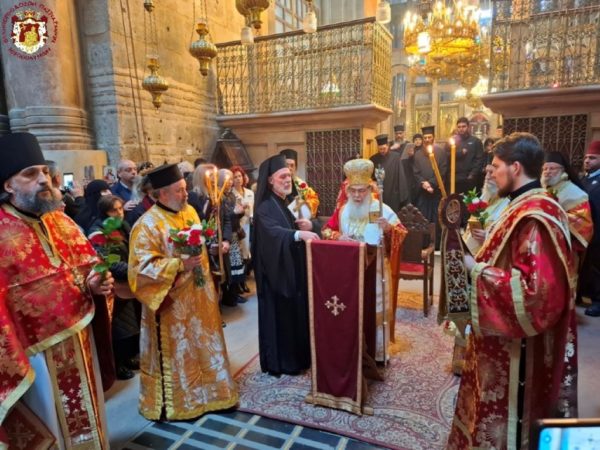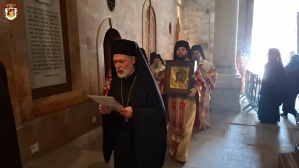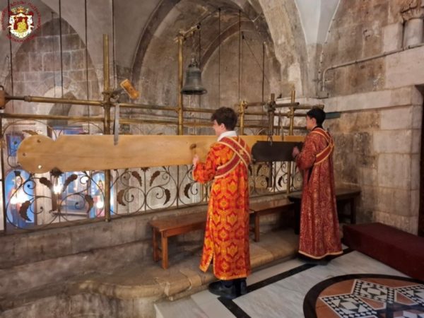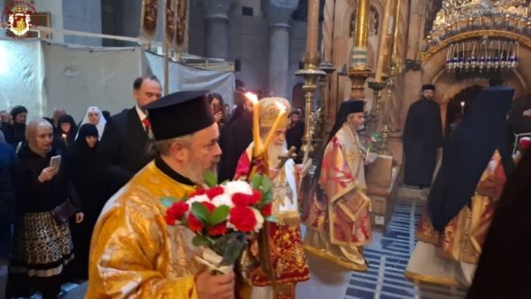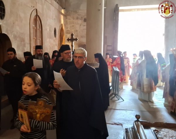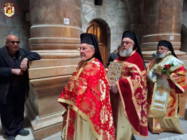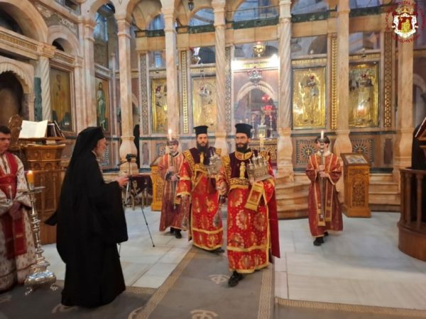 This event, essential to Orthodoxy, was confirmed by the Seventh Ecumenical Council of 843 AD. The Church of Jerusalem celebrated this by Vespers on Saturday afternoon at the Katholikon of the Church of the Resurrection, with veneration and incense at the Holy Deposition, veneration at the Holy Tomb and the Horrendous Golgotha, by the Holy Synod Fathers, with the Great Entrance, Artoklasia (Blessing of Bread), and incense, presided over by our Father and Patriarch of Jerusalem, His Beatitude Theophilos, with the co-prayer of the Archbishops of the Throne and the hieromonks and deacons of the Holy Sepulchre. The chanting was delivered by the chief cantor and deacon, Eustathios Tsoumanis, and with the participation of the congregation, mostly from Jerusalem’s monks, monastics, and pilgrims.