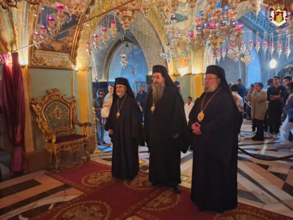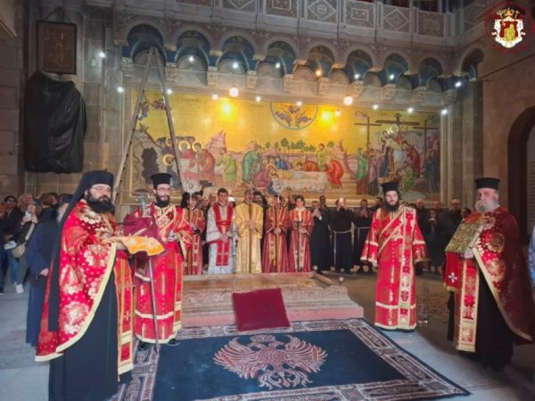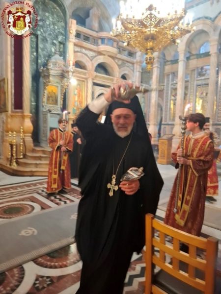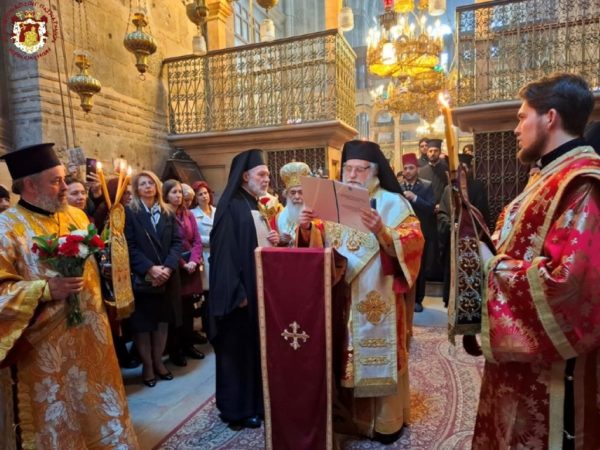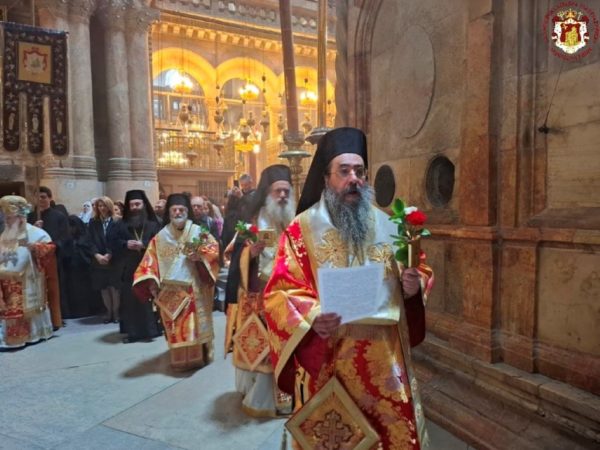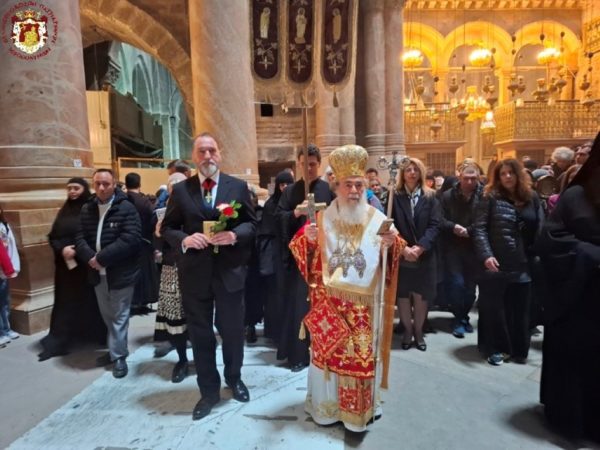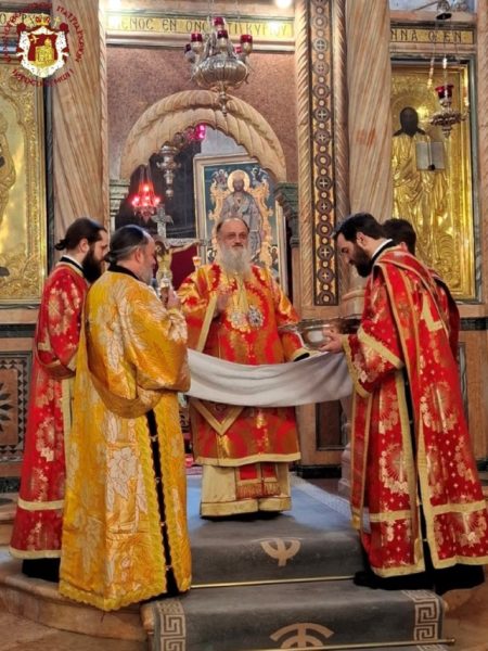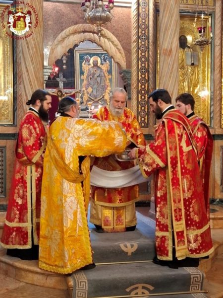 On the main feast day, the Divine Liturgy was celebrated at the Katholikon of the Church of the Holy Sepulchre, presided over by His Beatitude, our Father and Patriarch of Jerusalem, Theophilos, with the participation of their Eminences, Metropolitan Hesychios of Capitolias, and the Archbishops, Theophanes of Gerash, Dorotheos of Abila, Theodosios of Sebasteia, Demetrios of Lydda, Makarios of Qatar, and Philoumenos of Pella, Hieromonks of the Holy Sepulchre, with the first being the Elder Kamarasis, Archimandrite Nektarios. The chanting was delivered by the chief cantor and deacon, Eustathios Tsoumanis, in the presence of the General Consul of Greece, Mr. Dimitrios Angelosopoulos, and with the participation of a large number of faithful and pilgrims.