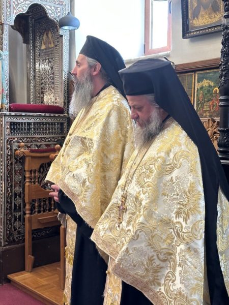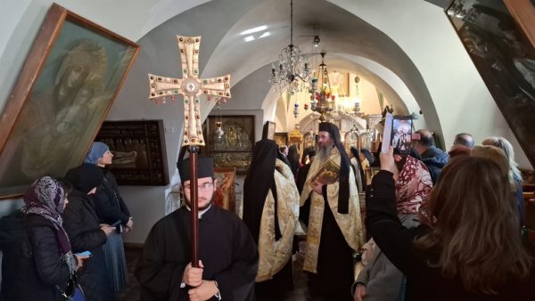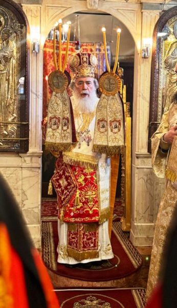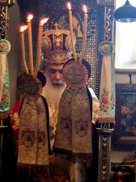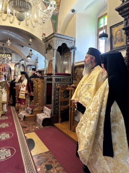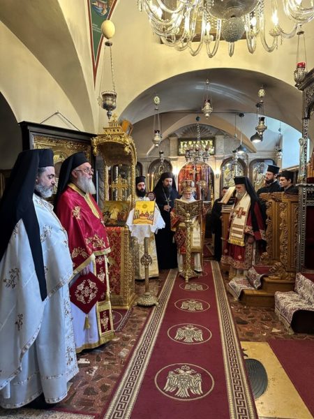 Likewise, the Divine Liturgy on Sunday morning was again celebrated in the Monastic and Patriarchal Church of Saints Constantine and Helen. His Beatitude, our Father and Patriarch of Jerusalem, Theophilos III, officiated, and concelebrating with him were their Eminences, Metropolitan Hesychios of Capitolias, Archbishop Dorotheos of Avila, and Archbishop Aristarchos of Constantina, together with the clergy of the Church, Archdeacon Mark and Hierodeacon Prodromos. The chanting was led by the chief cantor of the Church of the Holy Sepulchre, Deacon Efstathios. The service was attended by nuns, a few Jerusalemite faithful, and a small number of pilgrims, in the presence of the Consul General of Greece in Jerusalem, Mr Dimitrios Angelosopoulos.