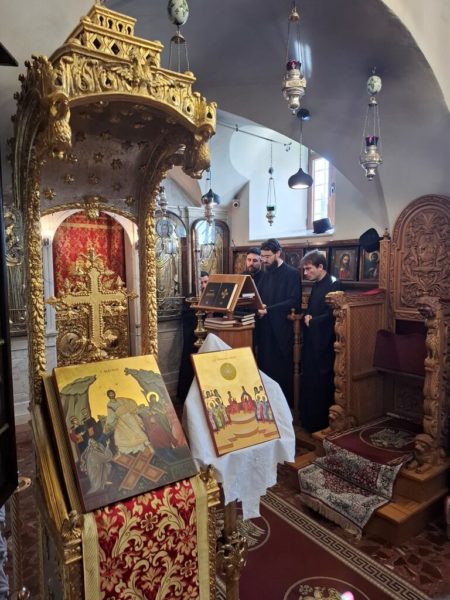 The veneration and restoration of the holy icons do not constitute merely a historical event, but pertain to the great mystery of the divine and redeeming Providence. Therefore, despite the present war crisis (and its consequence, that we were unable to go to the Church of the Holy Sepulchre), we proceeded to the Church of our Central Monastery of the holy and God-crowned Great Constantine and Helen, where we celebrated the “Great Parrhesia” of the First Sunday of the Fast, that is, the Patriarchal Divine Liturgy, concelebrated by the honourable members of our venerable Holy Sepulchre Brotherhood—Hierarchs, Priests, and Hierodeacons—with monks, nuns, and devout visiting pilgrims participating in prayer.