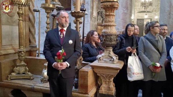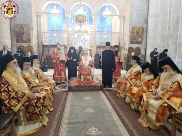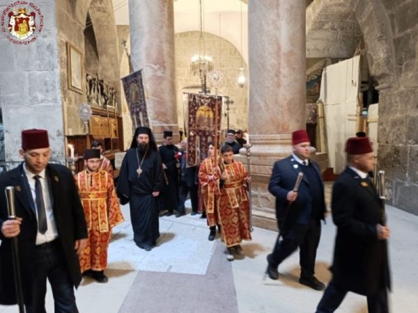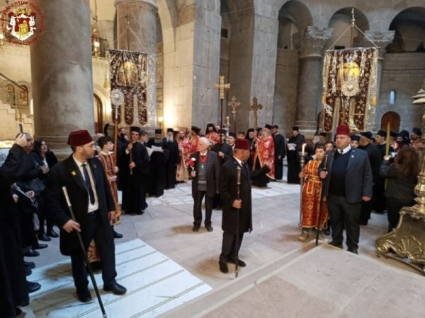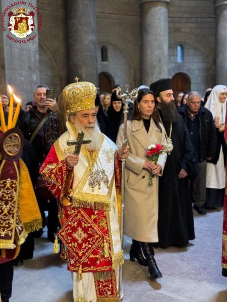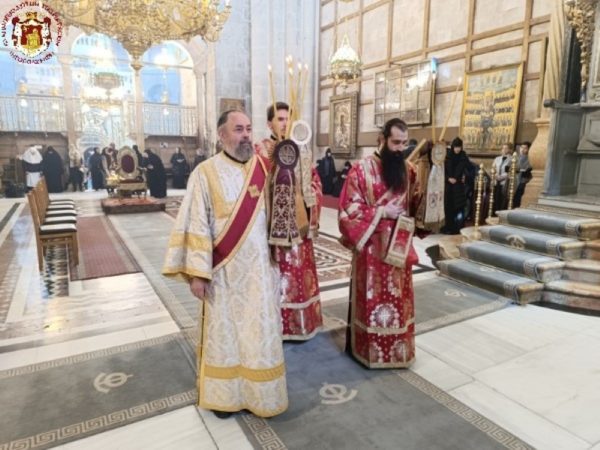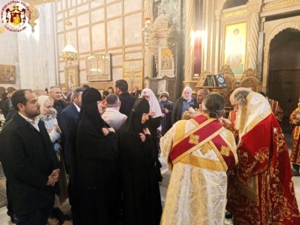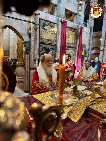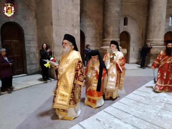 On Sunday morning the Divine Liturgy at the Catholicon of the Church of the Holy Sepulchre was officiated by His Beatitude with con-celebrants their Eminences, Metropolitan Isychios of Kapitolias, the Archbishops, Theophanes of Gerash, Aristarchos of Constantina, Theodosios of Sebasteia, Dimitrios of Lydda, the Elder Kamarasis Archimandrite Nectarios and other Holy Sepulchre Hieromonks, the representative of the Church of Russia Archimandrite Vassianos, the representative of the Church of Romania Archimandrite Theophilos, Archdeacon Mark and Hierodeacons Eulogios and Dositheos. The chanting was delivered by Hierodeacon Simeon and Mr Eustathios Tsoumanis, at the honorary presence of the Consul General of Greece in Jerusalem Mr Dimitrios Angelosopoulos and the Ambassador of Georgia Mr Zaza Kandelaki.
