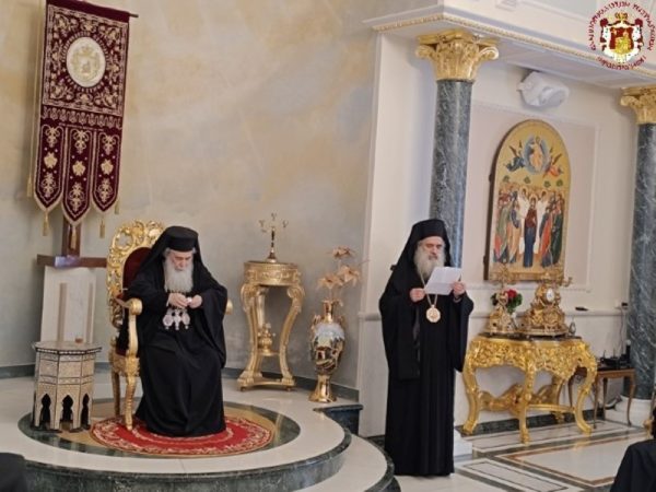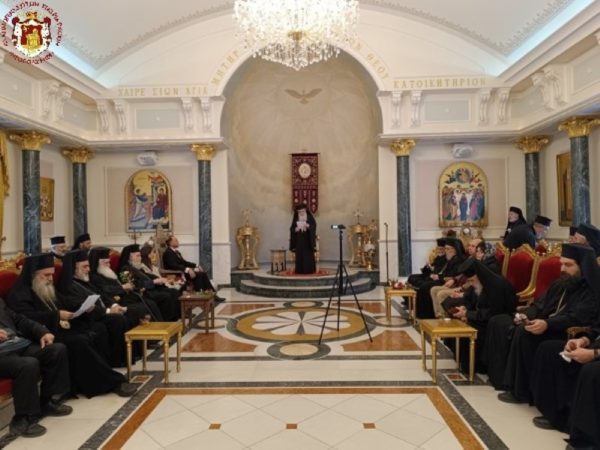After the Dismissal of the Divine Liturgy, the full congregation returned to the Patriarchate Hall, where His Beatitude our Father and Patriarch of Jerusalem Theophilos addressed those present as follows: