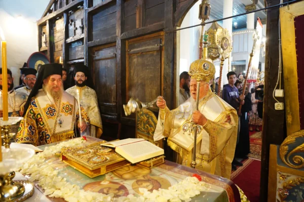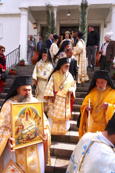 His All-Holiness, from the Royal Gates, read the Holy Gospel in Greek and then it was read successively in Turkish by Archimandrite Grigorios Grigoriadis, into Italian by Deacon of the Order Varnavas Grigoriadis, in English by Patriarchal Deacon Ieronymos Sotirelis, and in Slavonic by the Grand Syncellus Archimandrite Iakovos, and finally, as usual, from the pulpit it was read again in Greek by Deacon of the Order.