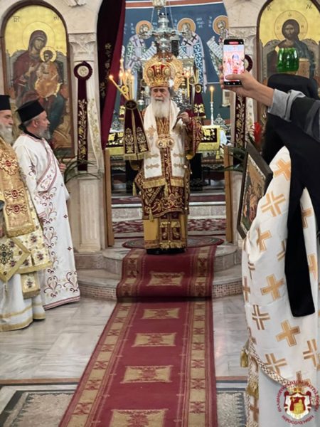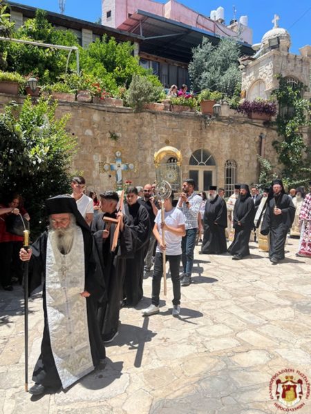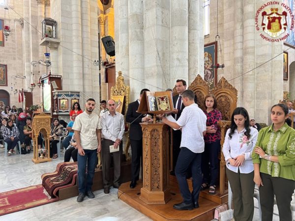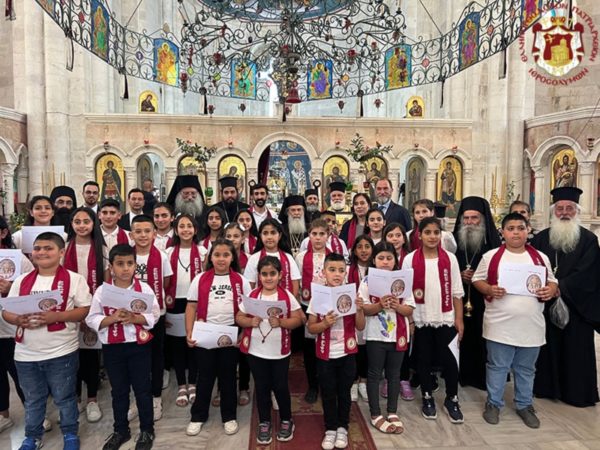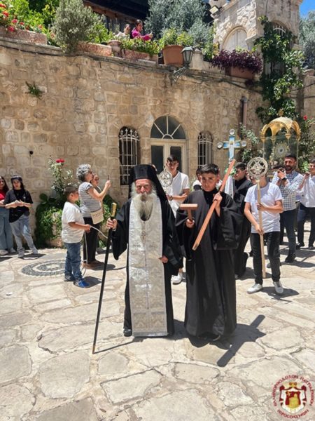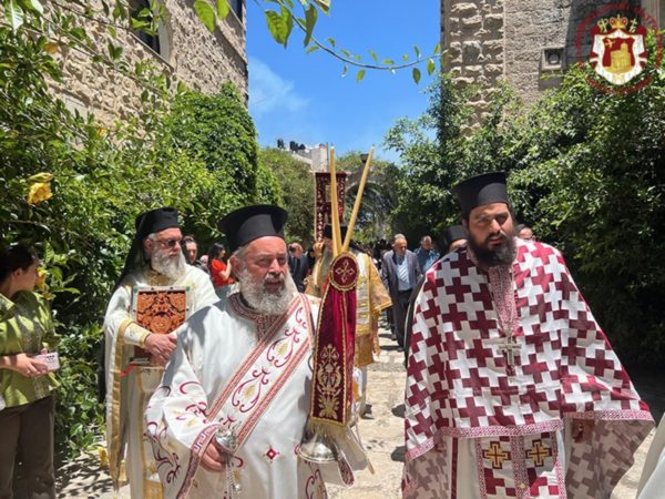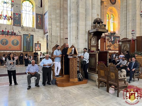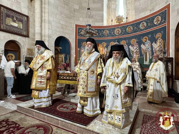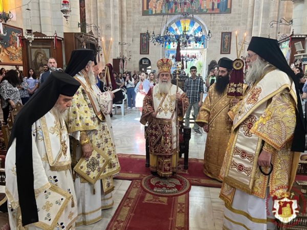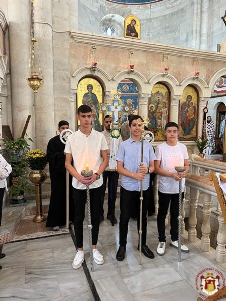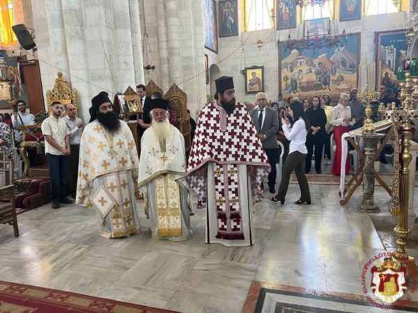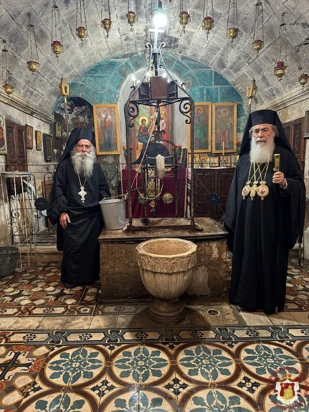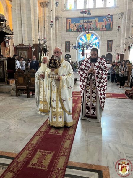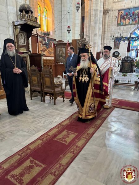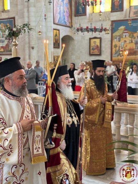 There, by Jacob’s Well and within the surrounding Church, which was erected by the active Hegoumen Archimandrite Ioustinos, H.H.B. our Father and Patriarch of Jerusalem Theophilos, celebrated the Divine Liturgy with the co-celebration of their Eminences, Metropolitan Isychios of Kapitolias, the Metropolitan Epiphanios of Lydra and Hegoumen of the H. Monastery of Machaira, the Archbishops Aristarchos of Constantina, the Elder Kamarasis Archimandrite Nectarios, Archimandrite Christodoulos, priests of the region of Samaria, the Hegoumen Rafidia Archimandrite Leontios, Archdeacon Markos and Hierodeacon Dositheos. The chanting was delivered by the Hegoumen of Rafidia Archimandrite Leontios in Greek and the Nablus Byzantine choir in Arabic. The service was attended by the Consul General of Greece in Jerusalem Mr Dimitrios Angelosopoulos and the local congregation.