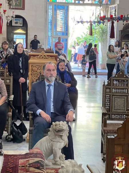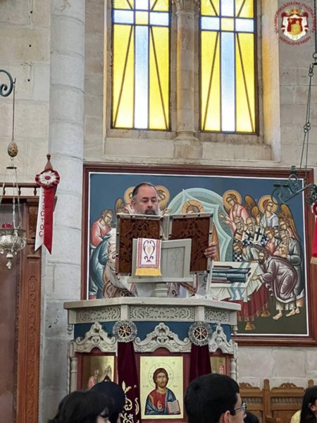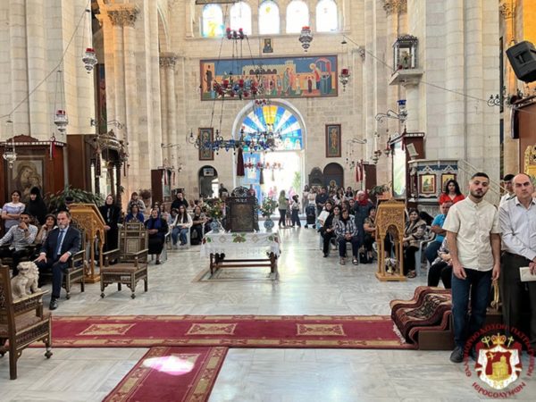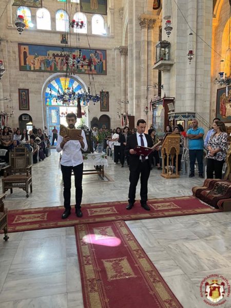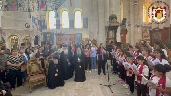 After the Divine Liturgy, a litany of three processions took place around the Holy Church. Before exiting the Holy Church, His Beatitude gladly heard the hymn “Christ is risen” in Greek and Arabic, as well as other religious hymns by a group of students from the Catechetical school of Zababde, under the lead of the Rum-Orthodox faithful Daoud, who studied theology in Cyprus.