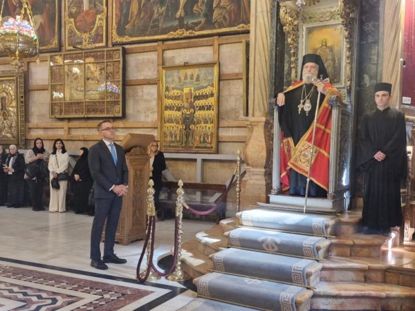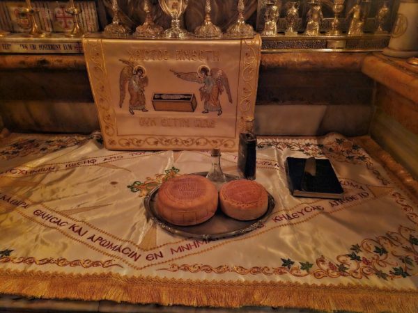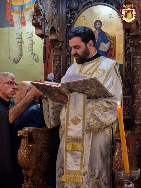 A. At the Church of the Holy Sepulchre, as a “Parhesia,” that is, with a festive Vespers service in the evening, including an entrance and veneration at the Holy Deposition and the Holy Sepulchre, the offering of incense, the Great Entrance, and the blessing of bread at the Catholikon, and with the celebration of the Divine Liturgy in the morning at the Most Holy and Life-giving Tomb. The Patriarchal Commissioner, His Eminence Metropolitan Isychios of Capitolias, presided, concelebrating with His Eminence Archbishop Theophanes of Gerash and His Eminence Archbishop Theodosios of Sebastia, along with Hieromonks of the Holy Sepulchre, led by the Master of Ceremonies, Archimandrite Bartholomew, and others. The chanting was led by Hierodeacon Symeon together with the students of the Patriarchal School of Zion, with the participation of members of the Greek community of Jerusalem and pilgrims from Greece, Cyprus, Russia, and Romania, who had remained for the Paschal period, in the presence of the Consul of Greece, Mr Petros Anagnostaras.