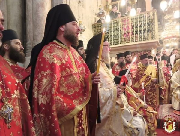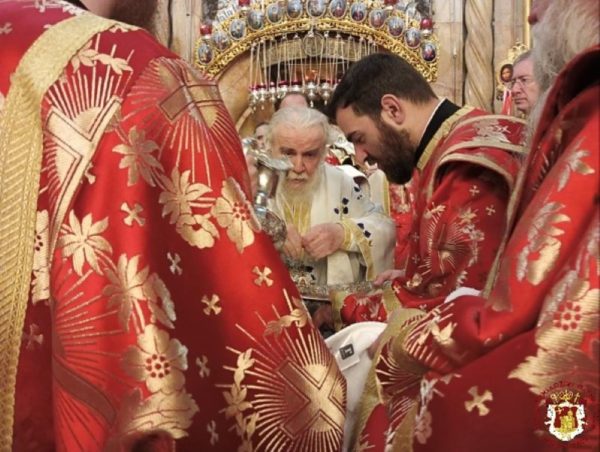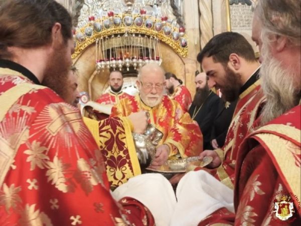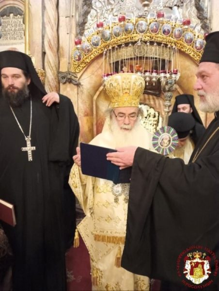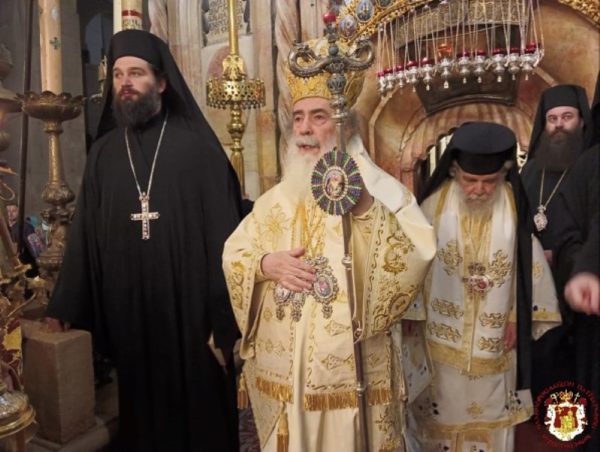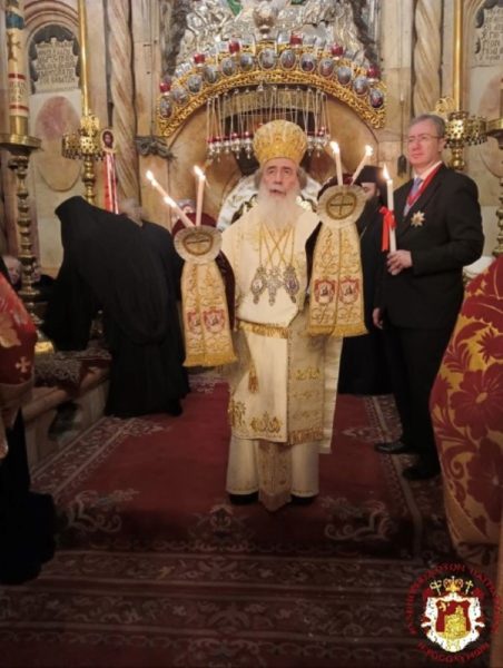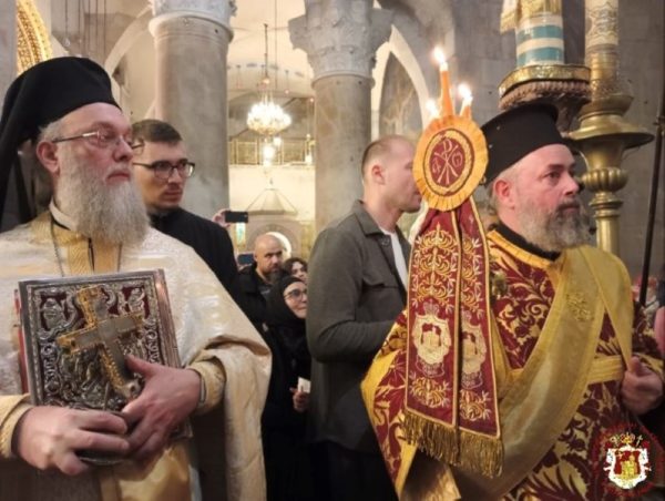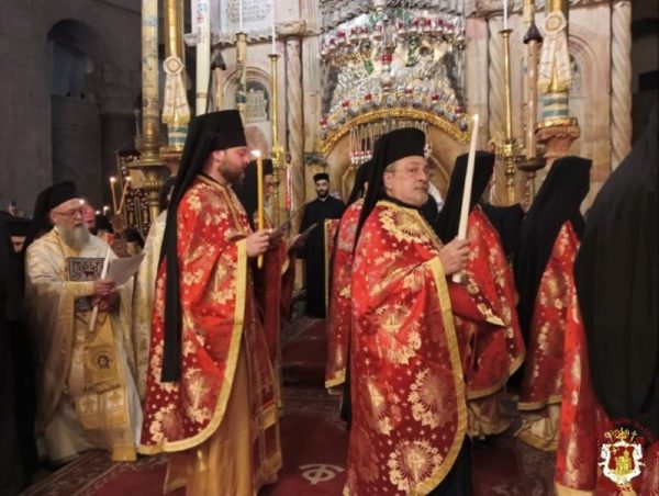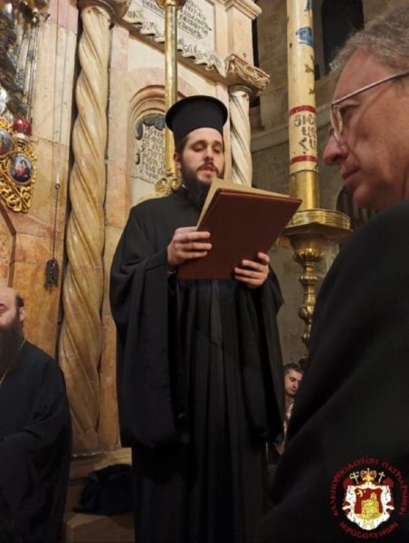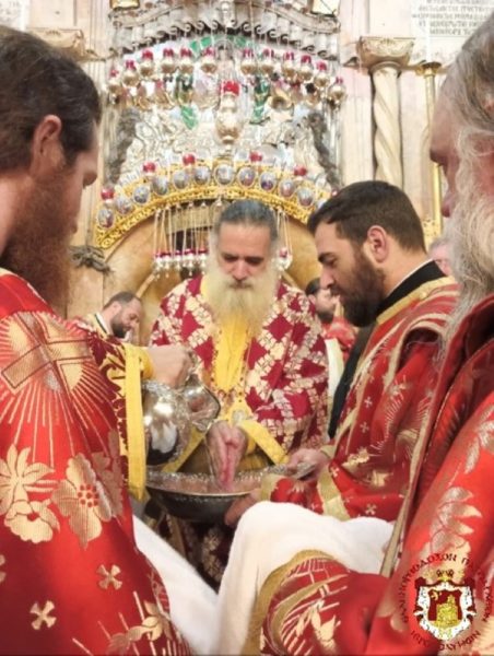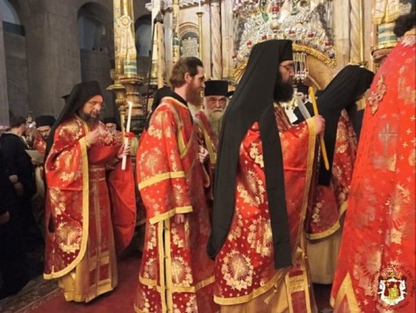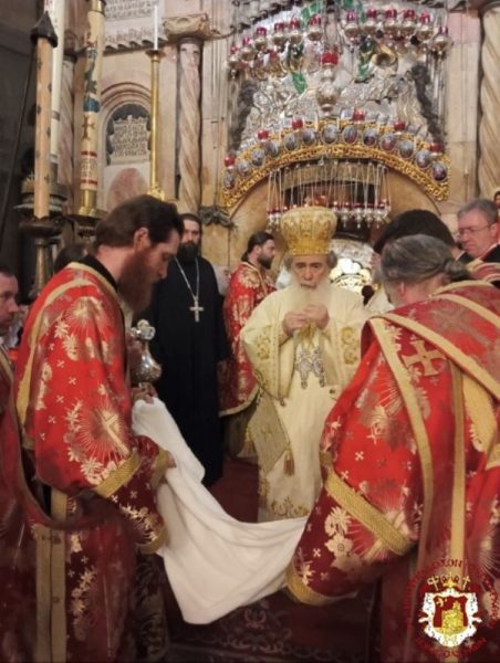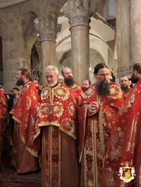 The Service was officiated by His Beatitude our Father and Patriarch of Jerusalem Theophilos, with the co-celebration of their Eminences, the Metropolitan Isychios of Kapitolias, the visiting Metropolitan Makarios of Anea from the Ecumenical Patriarchate, the Archbishops, Aristarchos of Constantina and Theodosios of Sebasteia, and Metropolitan Joachim of Helenoupolis, the Elder Kamarasis Archimandrite Nectarios and representatives from the Patriarchates of Moscow and Romania, Archimandrites Dometianos and Ioannis, many Priests from other Churches, Archdeacon Mark and Hierodeacons Eulogios and Dositheos.
