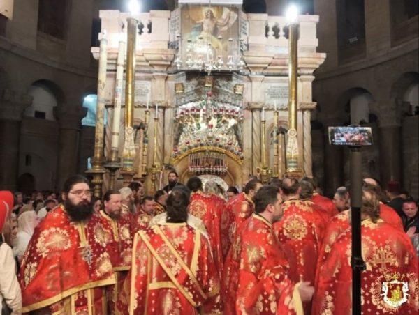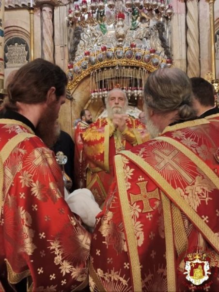 For this feast the Hagiotaphite Brotherhood went to the Church of the Holy Sepulchre, where bells tolling, the Canon of Holy Saturday was chanted, while the clergy, with their Primate, His Beatitude the Patriarch of Jerusalem Theophilos were being dressed. This was followed by a litany, three times around the Holy Sepulchre.