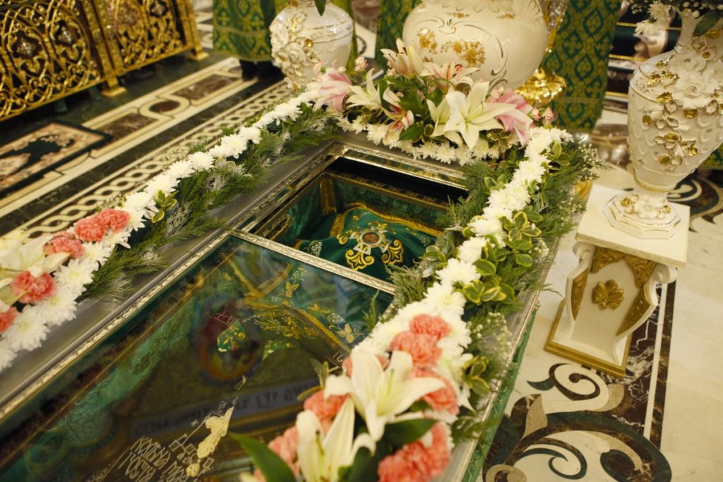 After the Liturgy, a crowded procession took place, during which the relics of St. Amphilochius were transferred to the cave church where they are permanently treasured. His relics had been transferred to the Transfiguration Cathedral in a procession held on December 30.