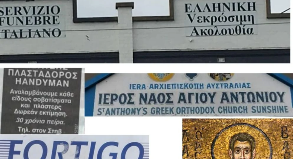 In time, even the way we render the Greek language is prone to change, often as a result of entrenched error. The names of our departed relatives on their tombstones are often permanently marred by mistakes made by masons unfamiliar with the Greek language. At my local cemetery the most common mistake involves the substitution of Greek letters with English ones, thus ΠΑΣΗΑΛΗΣ, ΧΑΡΑΛΑΜΡΟΣ, and ELENH. Greco-Australian alphabetical pastiches are not restricted to the dead, however. In the sign above the entrance to the church of St Andreas in Sunshine, the Greek P is rendered with an English R, to curious effect. Yet this too is representative of a common enough phenomenon among many first generation migrants: being semi-literate in Greek, and having spent the majority of their lives in Australia, it is quite natural for English letters to slowly penetrate their forms of written communication. My grandmother never learned to write in Greek. Her only form of education was the two years of Romanian school she attended in Epirus. For the rest of her life, she wrote Greek in Latin letters. A similar process has taken place among many Greek Australians and the documentary evidence they leave behind are a treasure trove for linguistic who trace the unique development and evolution of the Greek language as it is spoken and written in Australia.
