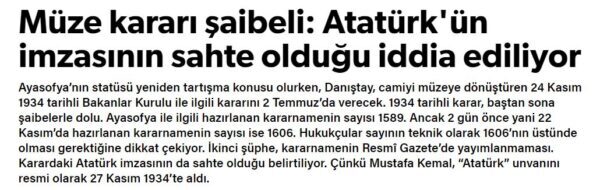 Moreover, the mass Turkish daily Yeni Safak on Tuesday regurgitated the issue of a forged signature of Kemal Ataturk, the founder of the modern Turkish state, in a 1934 ministerial decision turning the Hagia Sophia into a museum.