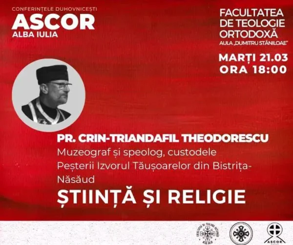 Părintele Crin-Triandafil Theodorescu, custodele Peșterii Izvorul Tăușoarelor din Munții Rodnei, Bistrița-Năsăud, va continua seria de conferinţe organizate în Postul Mare de Asociația Studenților Creștini Ortodocși Români (ASCOR) – filiala Alba Iulia.