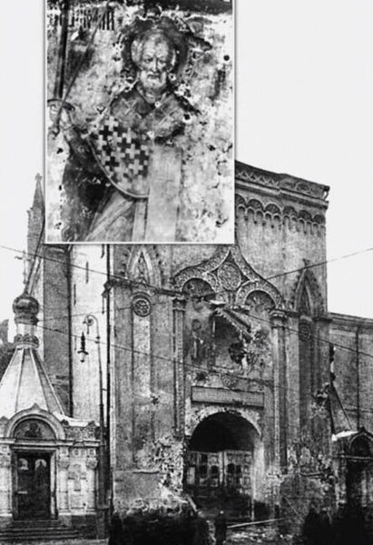 The flattened bullet was found and removed from the layer of plaster by restorers who began to restore the painting with the icon of St. Nicholas in the 2010s.