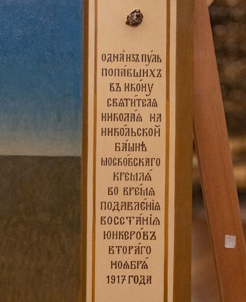 The bullet is one of the 40 that were shot at the icon of St. Nicholas that hung over the gates of the St. Nicholas Tower of the Moscow Kremlin during the anti-Bolshevik revolution of November 1-2, 1917, reports Foma.