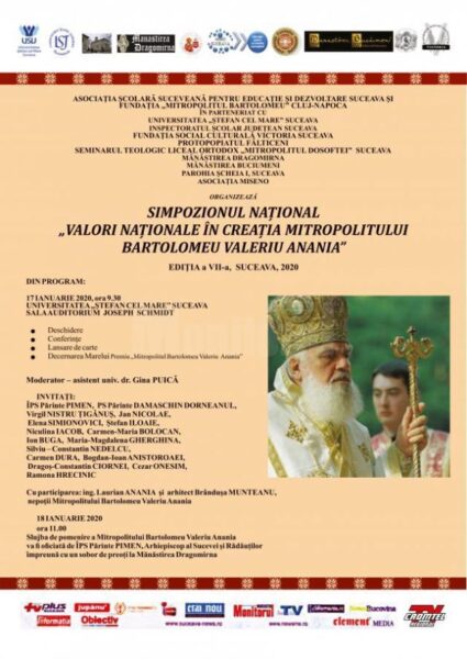 Asociația Școlară Suceveană pentru Educație și Dezvoltare și Fundația „Mitropolitul Bartolomeu” Cluj-Napoca vor organiza vineri ediția a VII-a a Simpozionului Național „Valori Naționale în creația Mitropolitului Bartolomeu Valeriu Anania”, informează Monitorul de Suceava.