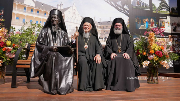 The concept behind the creation of this modest statue was vividly described by His Eminence Archbishop Makarios of Australia during the solemn unveiling ceremony, which took place on Tuesday, 15th October, in the presence of His All-Holiness Patriarch Bartholomew. As the Archbishop explained, the memories of the historic Patriarchal visit “were meant to have a permanent reference point, one that would forever testify to both present and future generations that the Patriarch of the Nation came to our region and blessed the people of our Archdiocese. […] We believe that art holds a unique power: to transcend what is heard and seen, to speak to us even when words no longer sound, to activate the eyes of our soul for those things that the eyes of the body struggle to discern. Therefore, trusting in this very revealing power of art, we decided to dedicate a sculpture to the blessed visit of our Patriarch, one which we hope will render him for evermore and experientially present among us.”