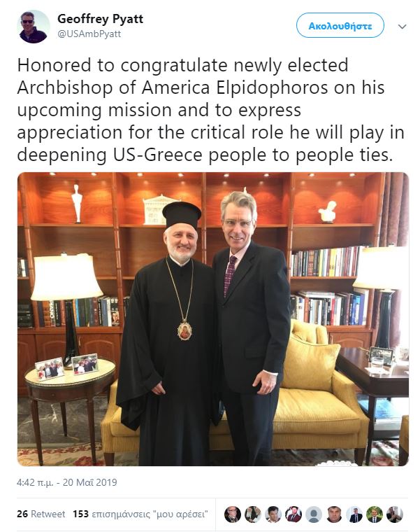 “Honored to congratulate newly elected Archbishop of America Elpidophoros on his upcoming mission and to express appreciation for the critical role he will play in deepening US-Greece people to people ties,” Pyatt said in a message on Twitter following a meeting in Athens.