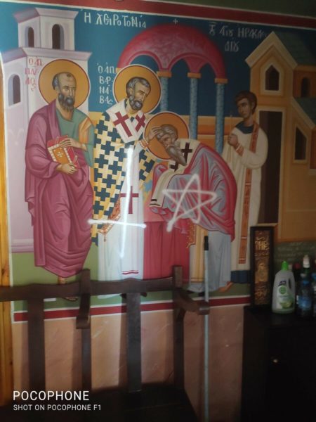 As can be seen in pictures from the incident, vandals covered the doors, walls, and icons of the church in the Nicosia District with spray-painted upside-down crosses and pentacle stars.