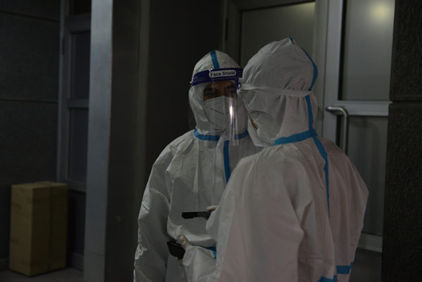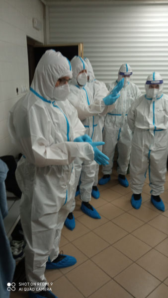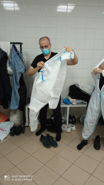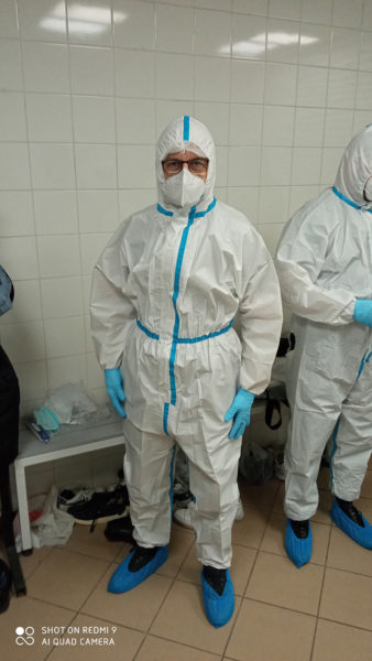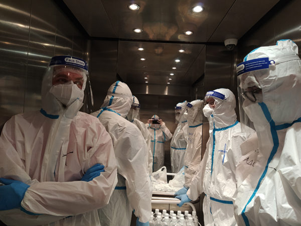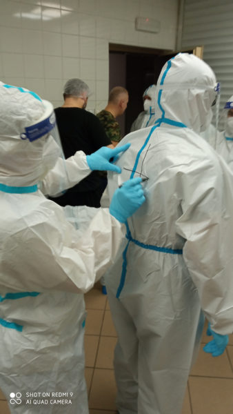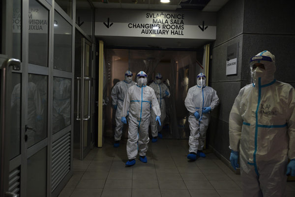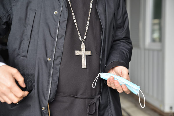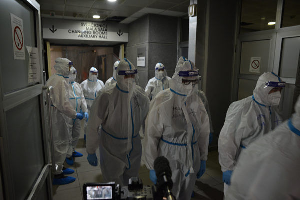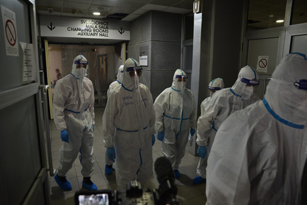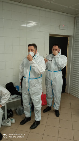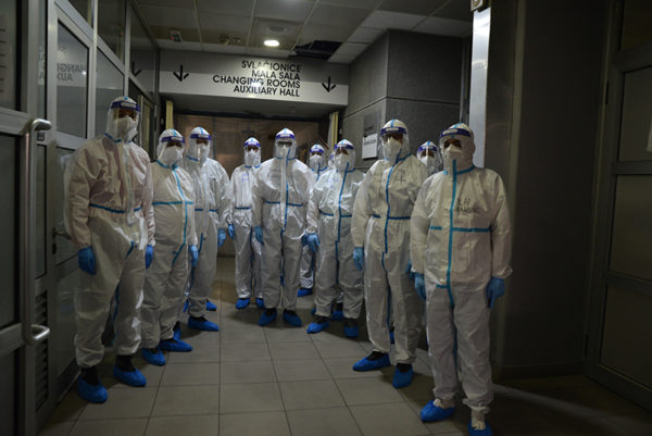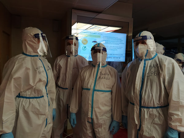 Protopresbyter-staurophor Vladimir Vukasinovic, head of the Ruzica church; priest Zoran Kerezovic, priest at the Clinical Center of Serbia; hieromonk Efrosin Uko, a graduate of the Faculty of Theology; deacons of the Ruzica church Srboljub Ubiparipovic, vice dean of the Orthodox Theological Faculty, and Vladimir Radovanovic, manager of the Museum of the Serbian Orthodox Church; religious teachers deacons Stevan Jovanovic and Velibor Martinovic and student Kristina Davidovic visited the Temporary COVID Hospital in Stark Arena in Belgrade.