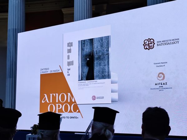 Με την πολυπληθή παρουσία προσωπικοτήτων από το φάσμα, της ορθοδοξίας, του πολιτισμού, των επιστημών, της πολιτικής και του επιχειρείν , έγινε στο Ζάππειο Μέγαρο στις 2-5-25, η παρουσίαση της φωτογραφικής έκθεσης «Άγιο Όρος, πέρα από το ορατό» του ταλαντούχου φωτογράφου Γιάννη Γιαννάτου – με φωτογραφίες από το Άγιο Όρος και την Αγία και Μεγίστη Μονή του Βατοπαιδίου- το περιεχόμενο της οποίας εξεδόθη και σε έναν μοναδικής αισθητικής επιμέλειας τόμο, με την ευγενική χορηγία του κοινωφελούς Ιδρύματος «ΑΙΓΕΑΣ» των Εφοπλιστών Αθανασίου και Μαρίνας Μαρτίνου, από τις εκδόσεις της Αγίας και Μεγίστης Μονής του Βατοπαιδίου.