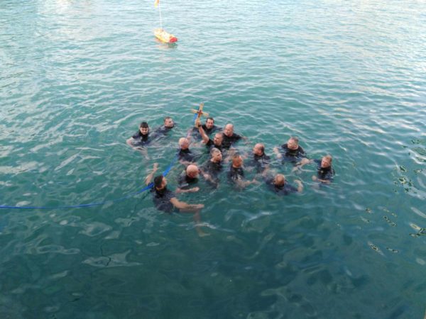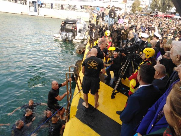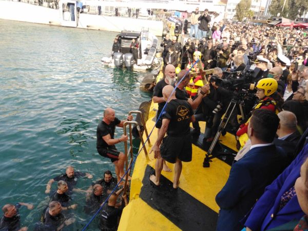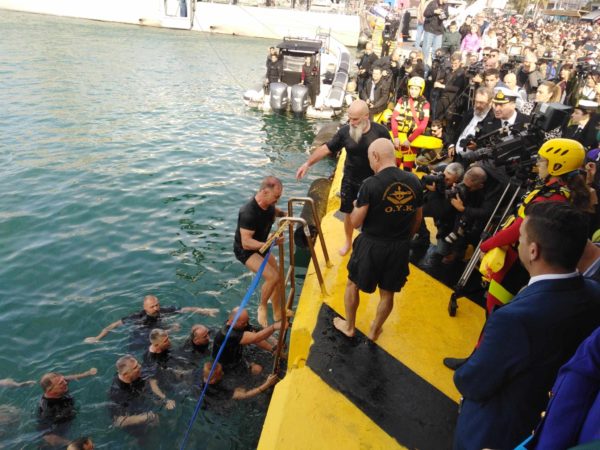 Μετά την πανηγυρική λειτουργία των Ιερών Θεοφανείων, επακολούθηση ο αγιασμός των υδάτων και η κατάδυση του τιμίου Σταυρού στο παρακείμενο λιμάνι του Πειραιά, όπου βούτηξαν άνδρες του πολεμικού ναυτικού και του λιμενικού μας για την ανάδυσή του. Σημειώνοντας συνάμα την άψογη και άτεγκτη διεξαγωγή της τόσο σημαντικής αυτής εορτής της Μητροπόλεως Πειραιά, που είχε και την αδιαμφισβήτητη φροντίδα και επιμέλεια του Διευθυντή του Γραφείου του Σεβασμιωτάτου κ.κ. Σεραφείμ, κου Δημητρη Αλφιέρη. Στιγμές άφατης κατάνυξης και ηθικής χαράς, για την ξεχωριστή ημέρα των Θεοφανείων της Ορθοδοξίας, που σηματοδοτεί τον ηθικό μας καθαγιασμό και την εκκίνηση – ηθική αφετηρία, μιας νέας, ευλογημένης και δημιουργικής χρονιάς!