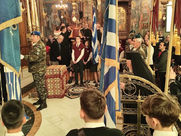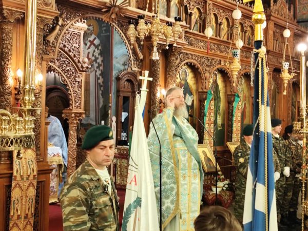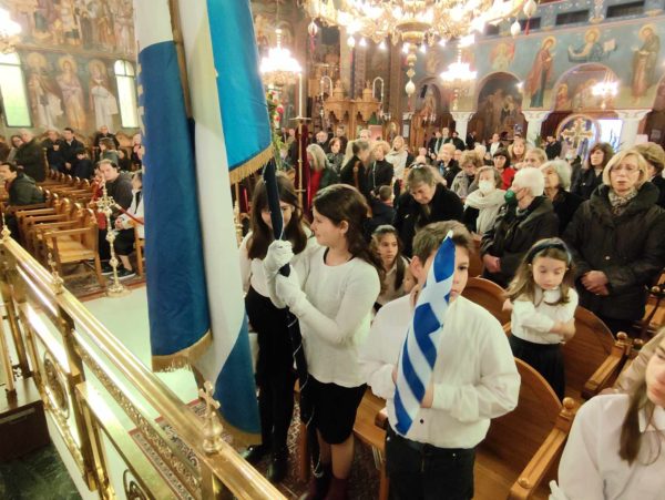 Της πανηγυρικής λειτουργίας χοροστάτησαν οι ευσεβείς ιερείς του Αγίου Ελευθερίου, πατέρες κ.κ. πρωτοπρεσβύτερος Θεμιστοκλής Χριστοδούλου – που είναι και ιερατικός προϊστάμενος του ναού – πρωτοπρεσβύτεροςΚαλπούζος Γεώργιος και οι ιερείς Σπυρίδων Βίτσης και Θωμάς Μάντζιος. Μετά την λειτουργία έλαβε χώρα η πανηγυρική δοξολογία, για το κορυφαίο ιστορικό ορόσημο της 25-ης Μαρτίου, ημέρα της εθνικής παλιγγενεσίας, όπου ομόψυχα ο λαός μας, οι αγωνιστές του βουνού και της στάνης, με τους αγωνιστές της θάλασσας και με την πνευματική επικουρία των προκρίτων, των λογάδων και του προμαχούντος κλήρου, αποτίναξαν το σκληρόν και απαραδειγμάτιστον τουρκικό ζυγό. Συγκινητική η παρουσία τριών δημοτικών σχολείων της περιοχής μετά των δασκάλων τους, αλλά και τμήματος της Εθνοφυλακής, που προσέδωσαν ξεχωριστό ηθικό χρώμα στην εορταστική λειτουργία. Με το πέρας της δοξολογίας με ένα θερμό λόγο που μας ζέστανε στην κυριολεξία την καρδιά και με την επικουρία της πολυμερούς θεολογικής και ιστορικής παιδείας του, ο πατέρας Θεμιστοκλής μίλησε για το εθνικό ορόσημο της 25-ης Μαρτίου και εμφατικά τόνισε την αδήριτη ανάγκη να συμμετέχουμε σε εκδηλώσεις για την ιστορική μνήμη και οι μεγαλύτεροι να μεταδώσουν στους νεότερους, την αγνή, άδολη και με δημοκρατικό ήθος αγάπη για την πατρίδα.