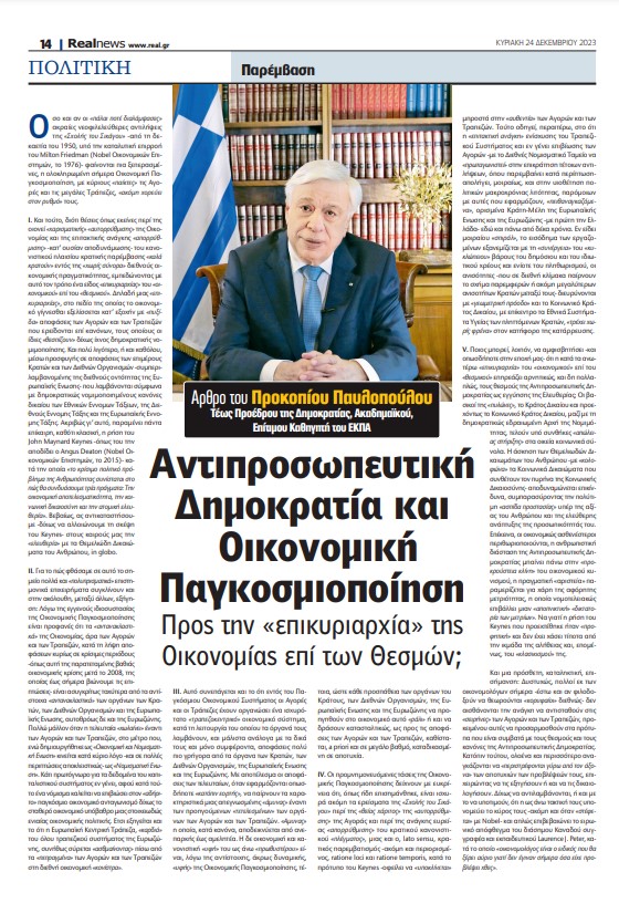 29/12/2023 30/12/2023 Άρθρο – παρέμβαση στη Realnews του τέως Προέδρου της Δημοκρατίας Προκόπη Παυλόπουλου: “Αντιπροσωπευτική Δημοκρατία και Οικονομική Παγκοσμιοποίηση – Προς την «επικυριαρχία» της Οικονομίας επί των θεσμών” Κυριακή 24 Δεκεμβρίου 2023 Όσο και αν οι «πάλαι ποτέ διαλάμψασες» ακραίες νεοφιλελεύθερες αντιλήψεις της «Σχολής του Σικάγου» -από τη δεκαετία του 1950, υπό την καταλυτική επιρροή του Milton...