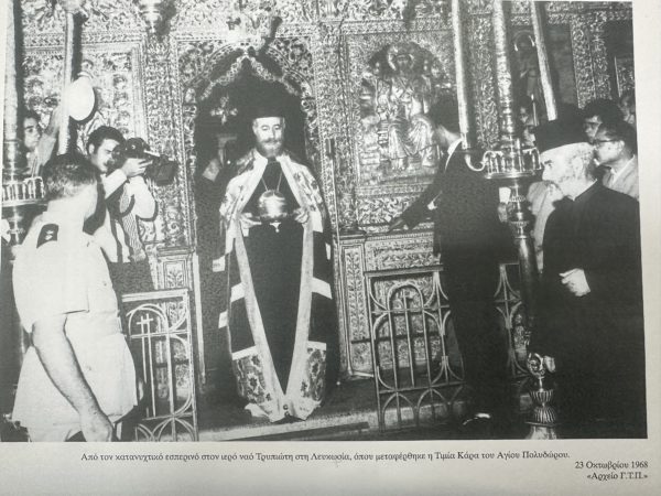 Στις 28 Σεπτεμβρίου 1968, ο Αρχιεπίσκοπος Μακάριος επιθυμώντας να μεταφερθεί για προσκύνημα από την Αθήνα στην Κύπρο η τιμία Κάρα του Αγίου Πολυδώρου του Κυπρίου, του μαρτυρήσαντος στην Έφεσο το 1794, απέστειλε επιστολή προς τον Αρχιεπίσκοπο της Ελλάδος Ιερώνυμο Κοτσώνη, από τον οποίο ζητά την κανονική άδεια και ευλογία, κάτι που με ευχαρίστηση αποδέχθηκε ο Αρχιεπίσκοπος Αθηνών.
