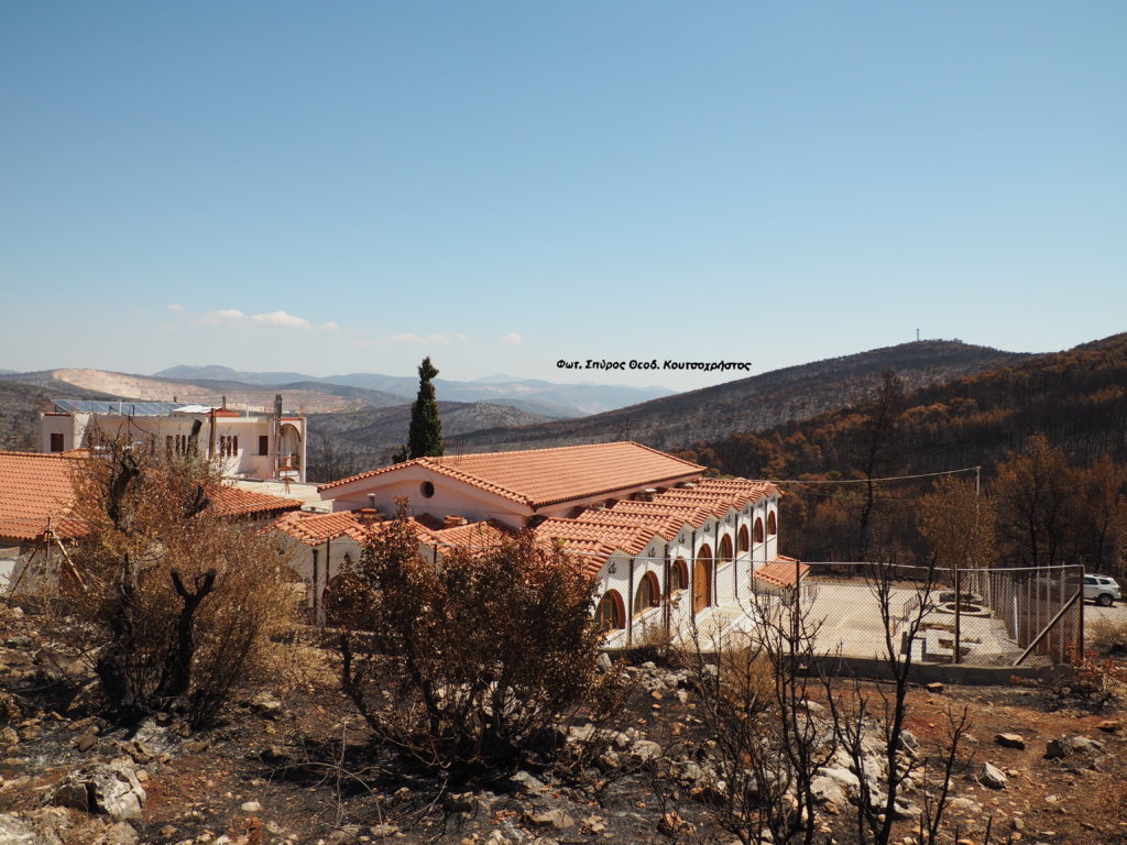 Η Ιερά Μονή Παναγίας και Οσίου Δαυίδ Μάνδρας Αττικής, γλίτωσε από φετινή δασική πυρκαγιά, γιατί δεν υπήρχε κανένα πεύκο στον περίβολό της.